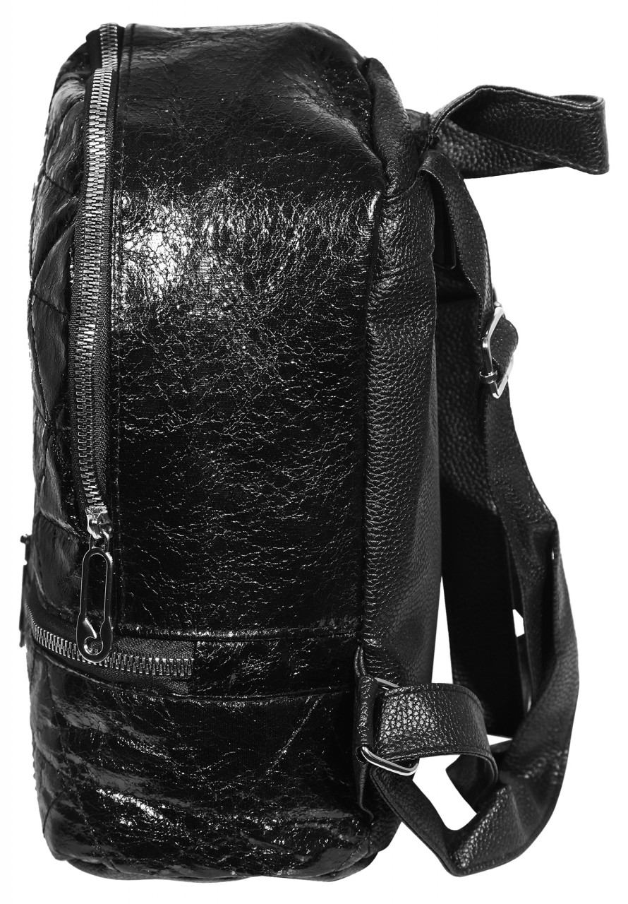 Mochila feminina confecionada em pele sintética e forro interno em plástico, com 3 fechos e 1 compartimento grande, 1 compartimento pequeno adicional na parte externa com fecho, alça removível, 1 alça de transporte, ajustável individualmente, 1 compartimento pequeno com fecho no interior. Medidas: 26 cm de comprimento, 23,5 cm de largura e 11,5 cm de espessura.