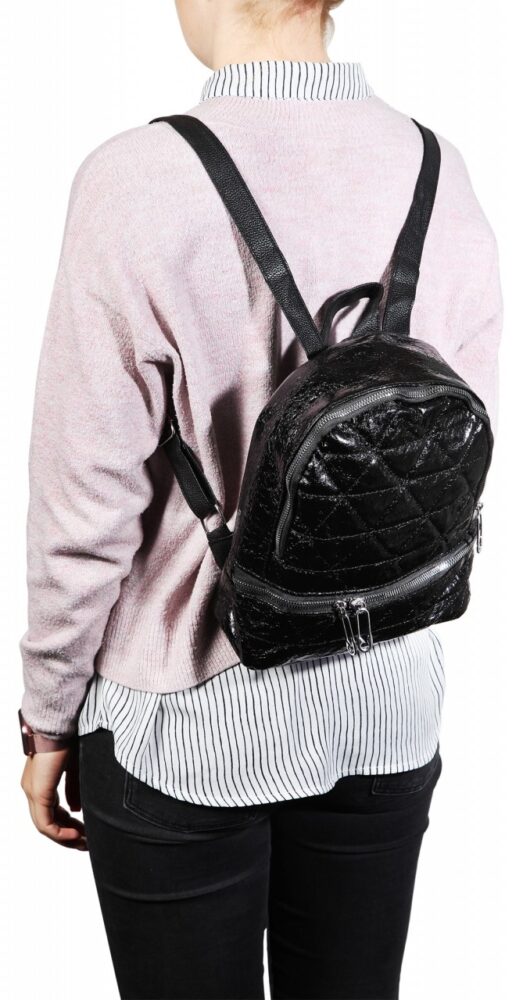 Mochila feminina confecionada em pele sintética e forro interno em plástico, com 3 fechos e 1 compartimento grande, 1 compartimento pequeno adicional na parte externa com fecho, alça removível, 1 alça de transporte, ajustável individualmente, 1 compartimento pequeno com fecho no interior. Medidas: 26 cm de comprimento, 23,5 cm de largura e 11,5 cm de espessura.