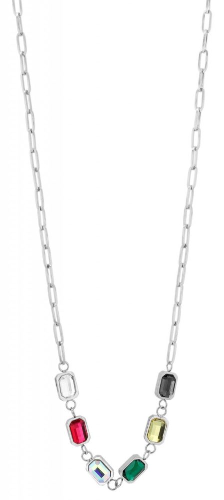Colar em aço inoxidável “Defne” com pingente. Dimensões: 44 + 5 cm. Está disponível em duas variantes deslumbrantes para que você possa escolher sua preferência: prateado ou dourado. 6 pingentes fixos medindo 7,5 x 5,5 mm cada, decorados com pedras coloridas de zircónia.