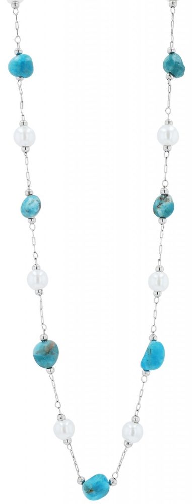 Colar em aço inoxidável “Derya” com pérolas de água doce e pedras azuis. Dimensões: 40,5 cm + 5,5 cm de extensão.