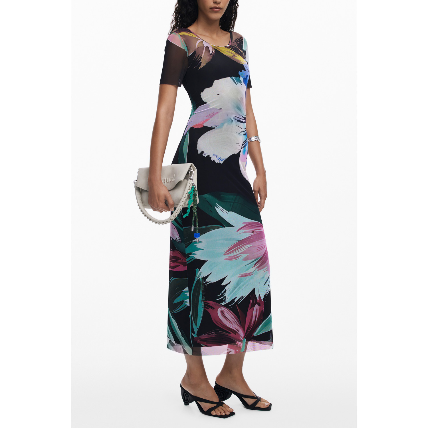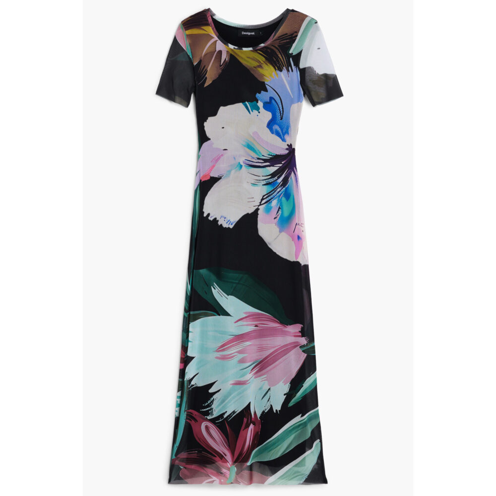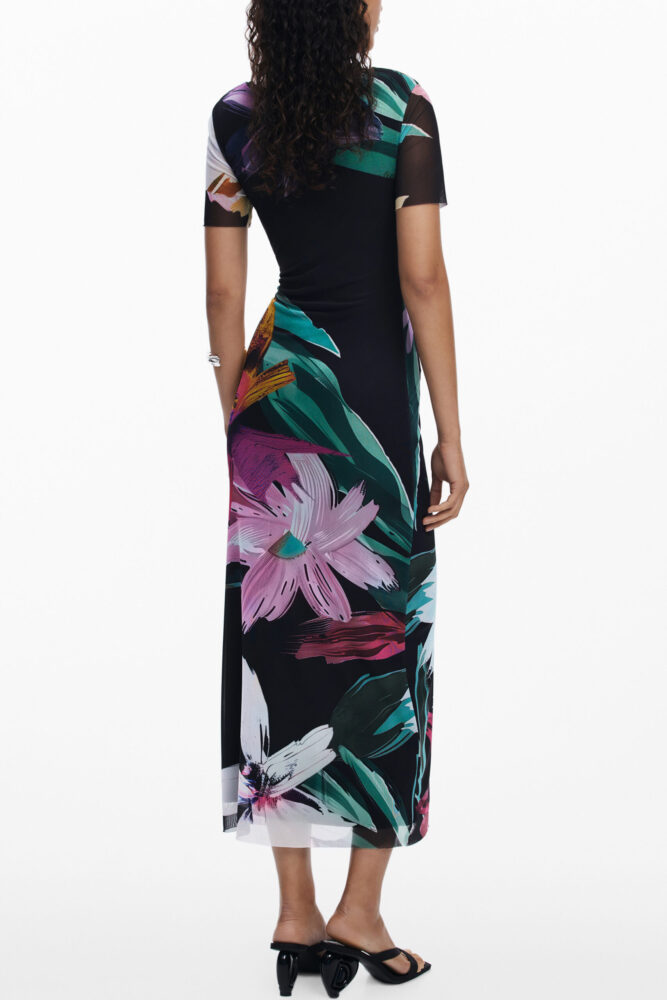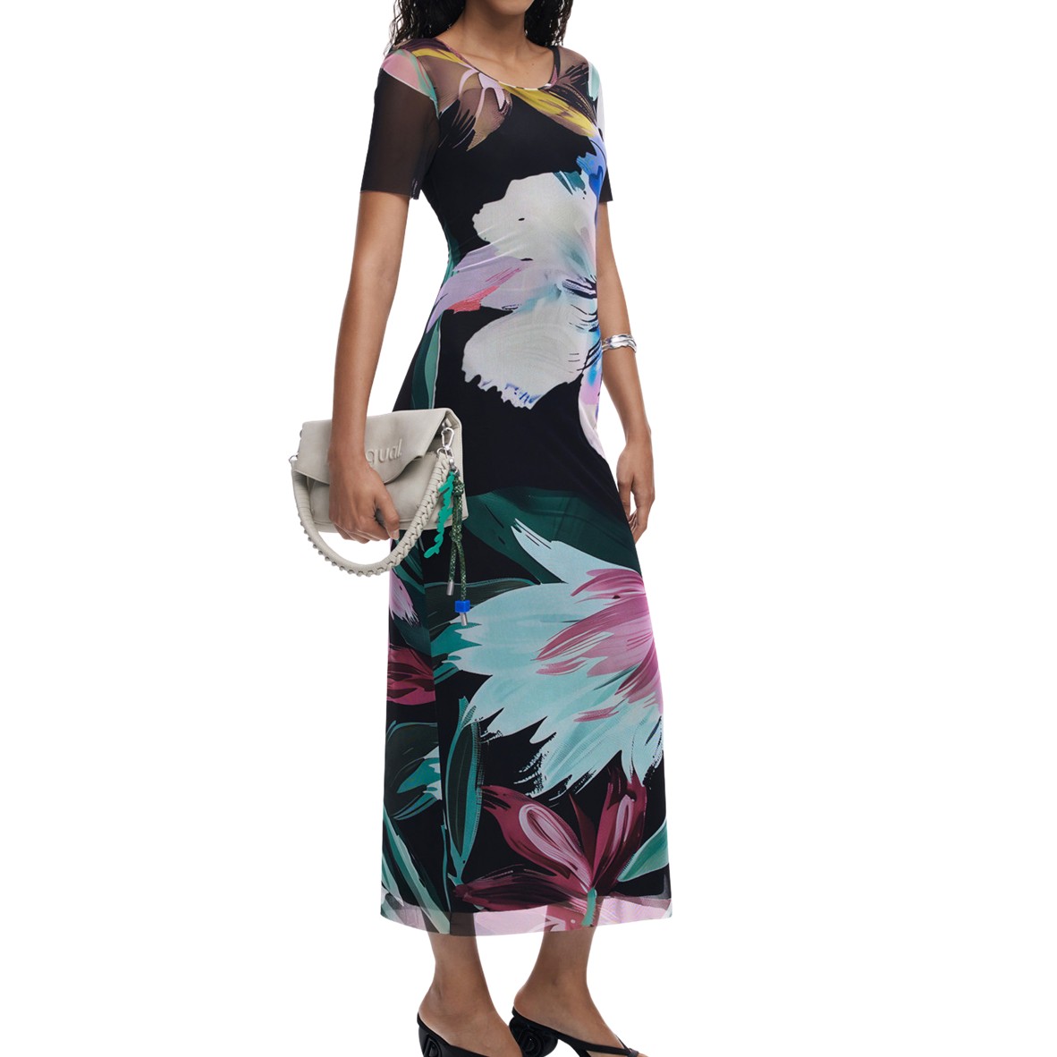 VESTIDO COMPRIDO COM PADRÃO, MANGAS CURTAS, BERNADETTE, GOLA REDONDA, LOGÓTIPO