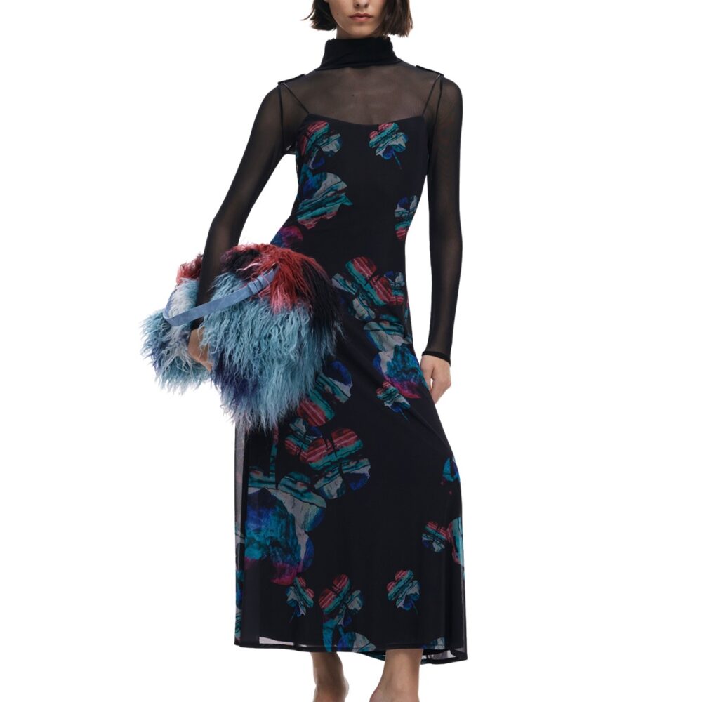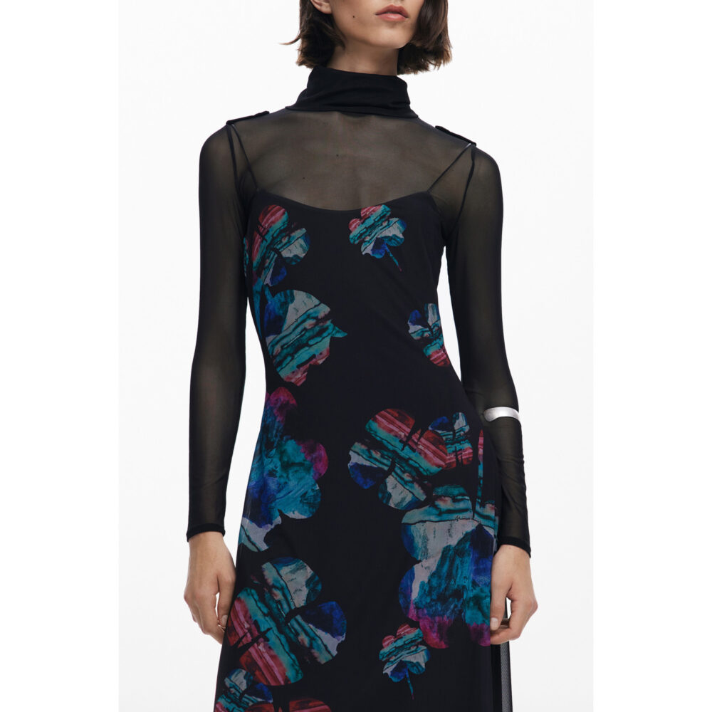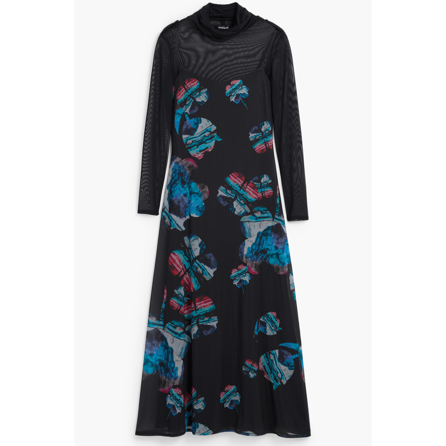 VESTIDO COMPRIDO COM T-SHIRT, AGUARELA, ALÇAS FINAS AJUSTÁVEIS, T-SHIRT DE MANGA COMPRIDA COM GOLA ALTA, DETALHES CONTRASTANTES, LOGÓTIPO