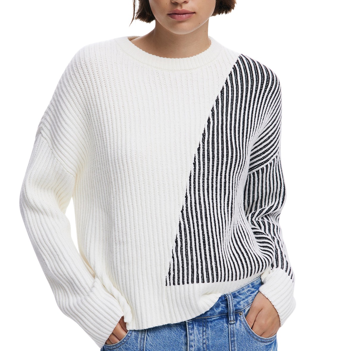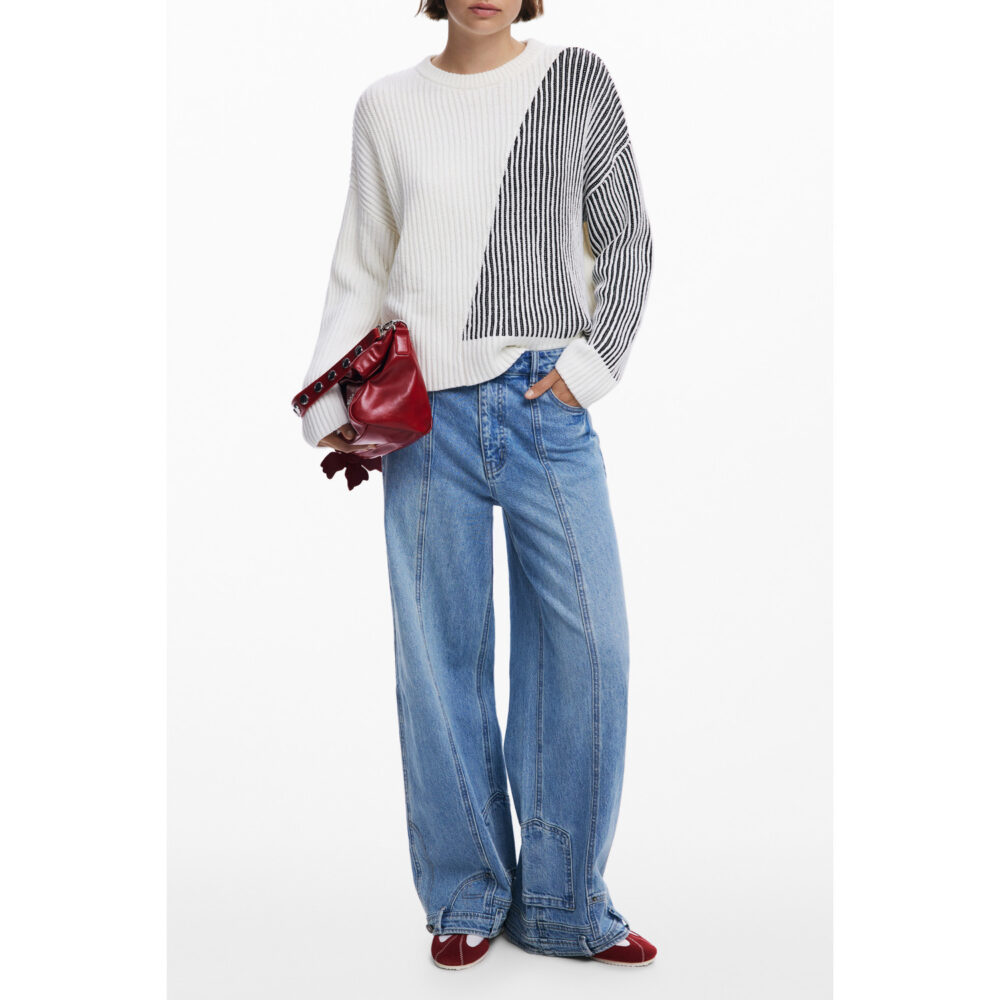 Manga comprida, gola redonda, pormenores em contraste e logótipo.