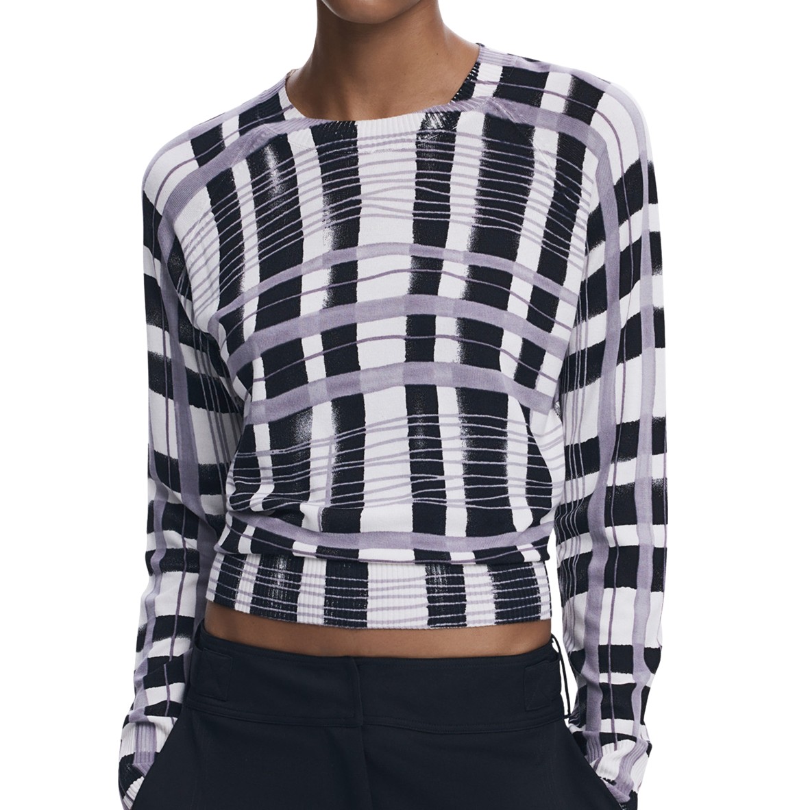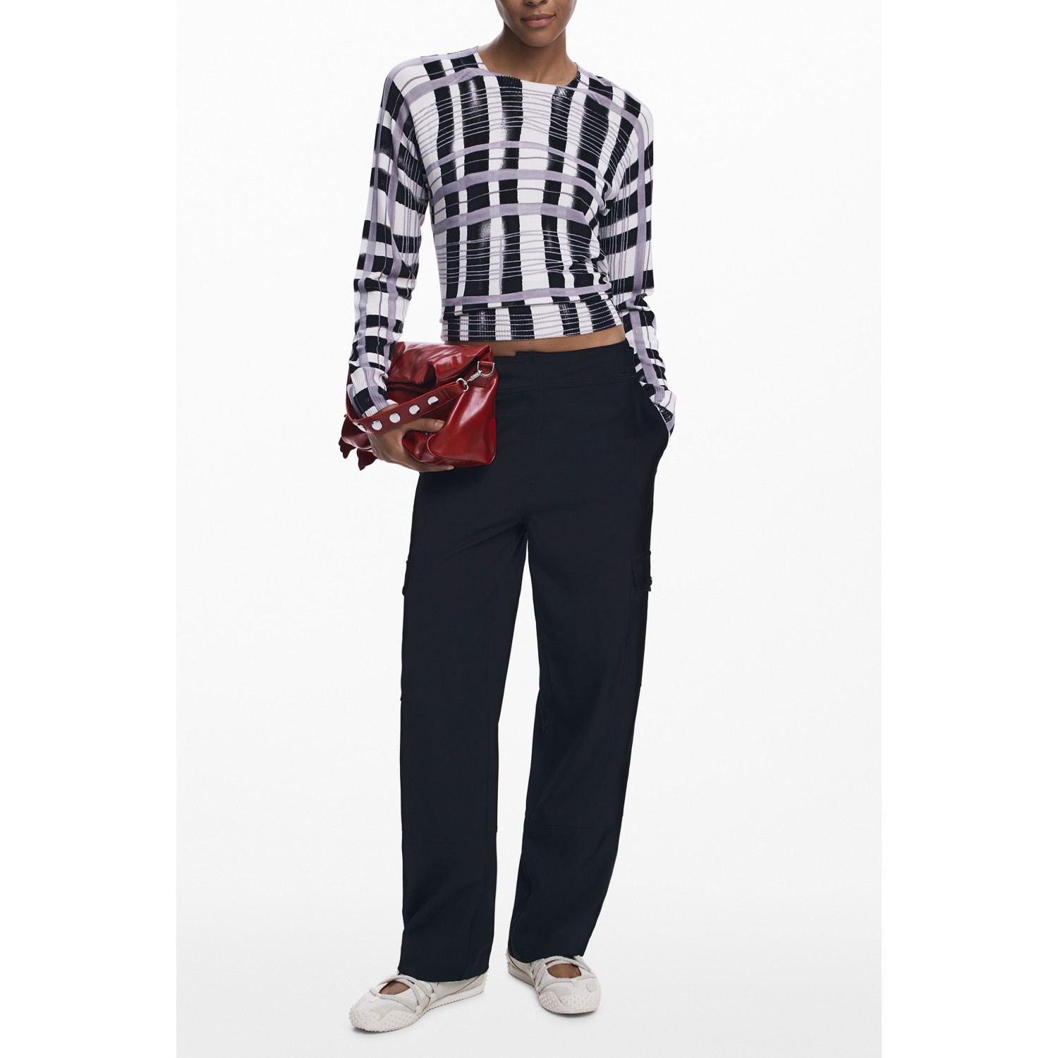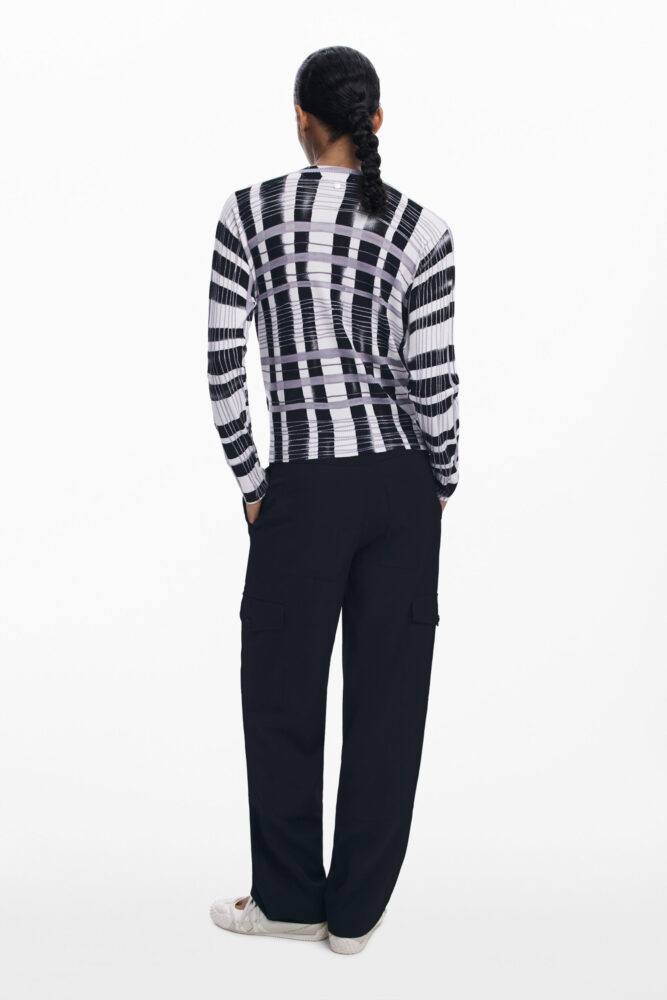 Manga comprida, gola redonda, pormenores em contraste e logótipo.