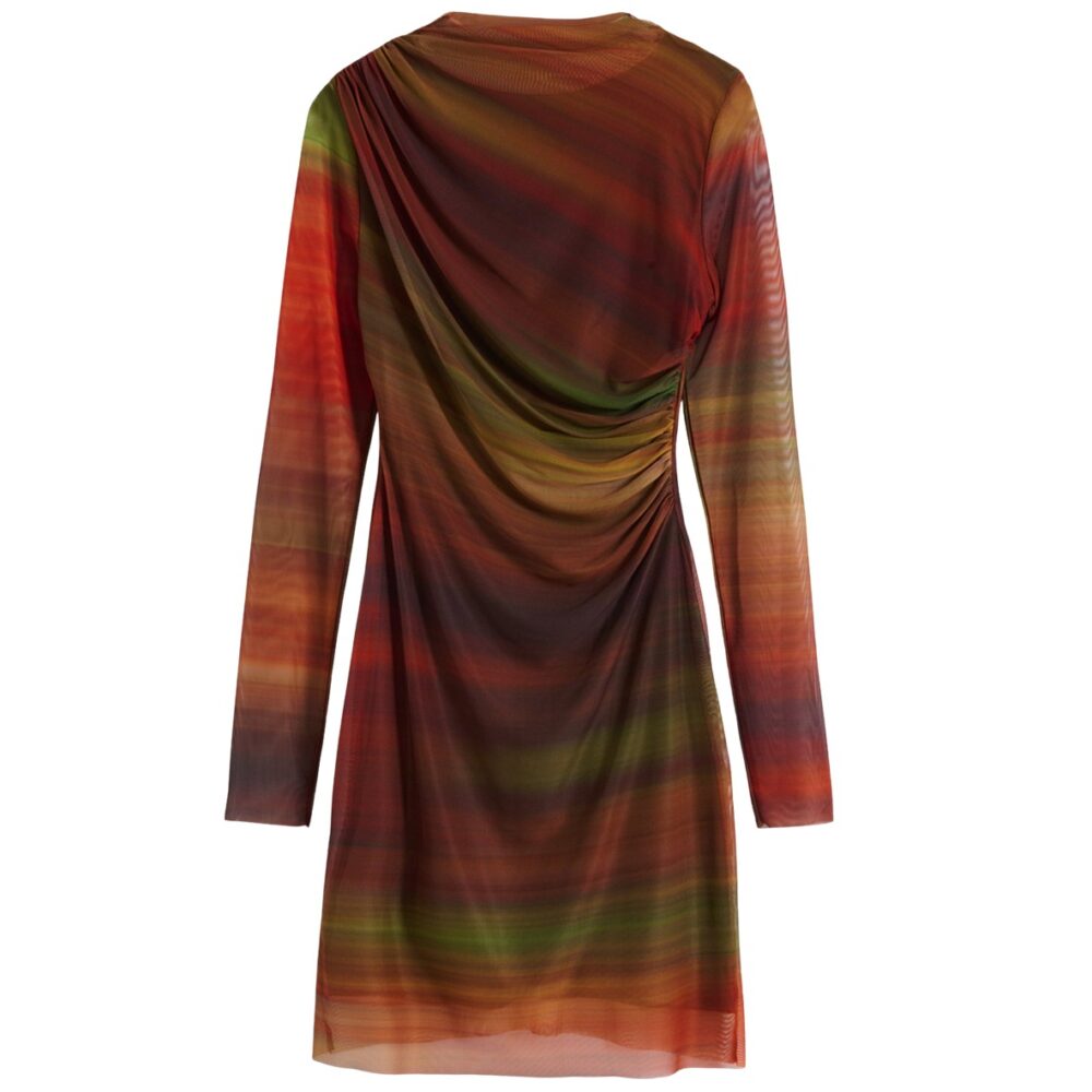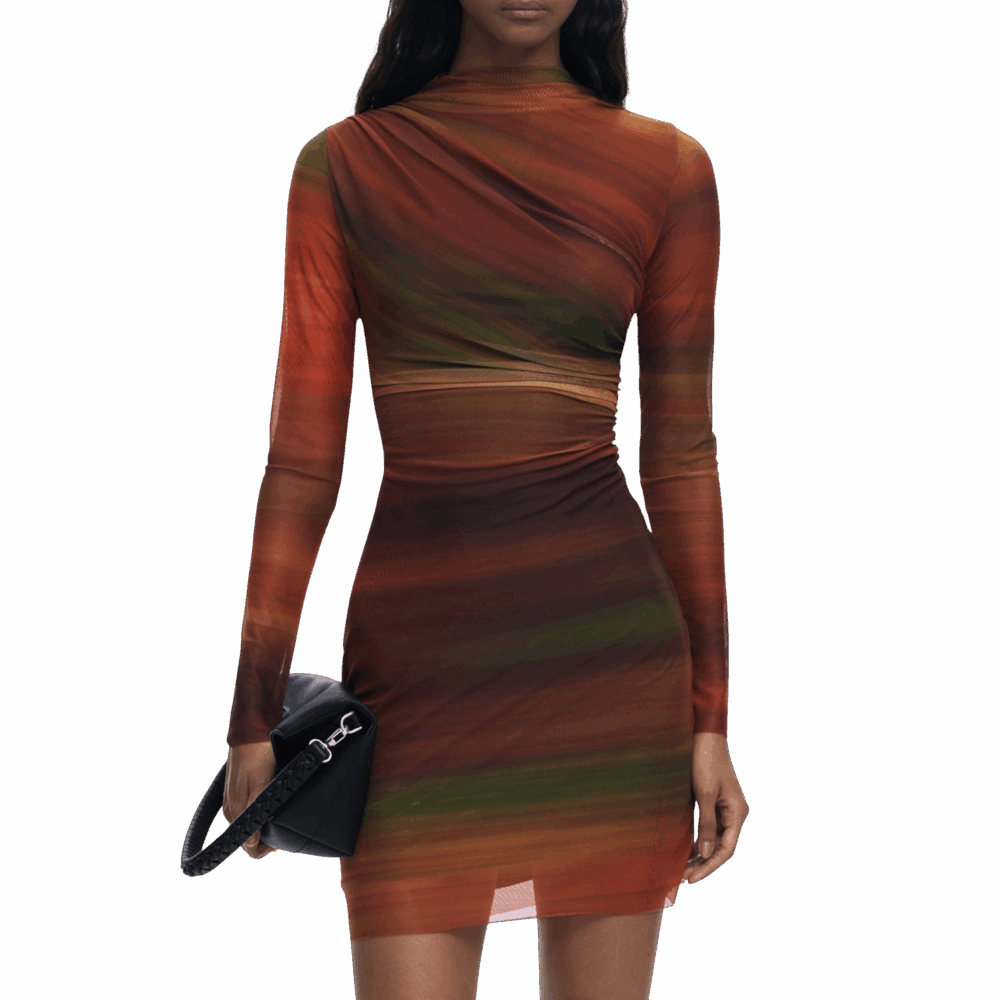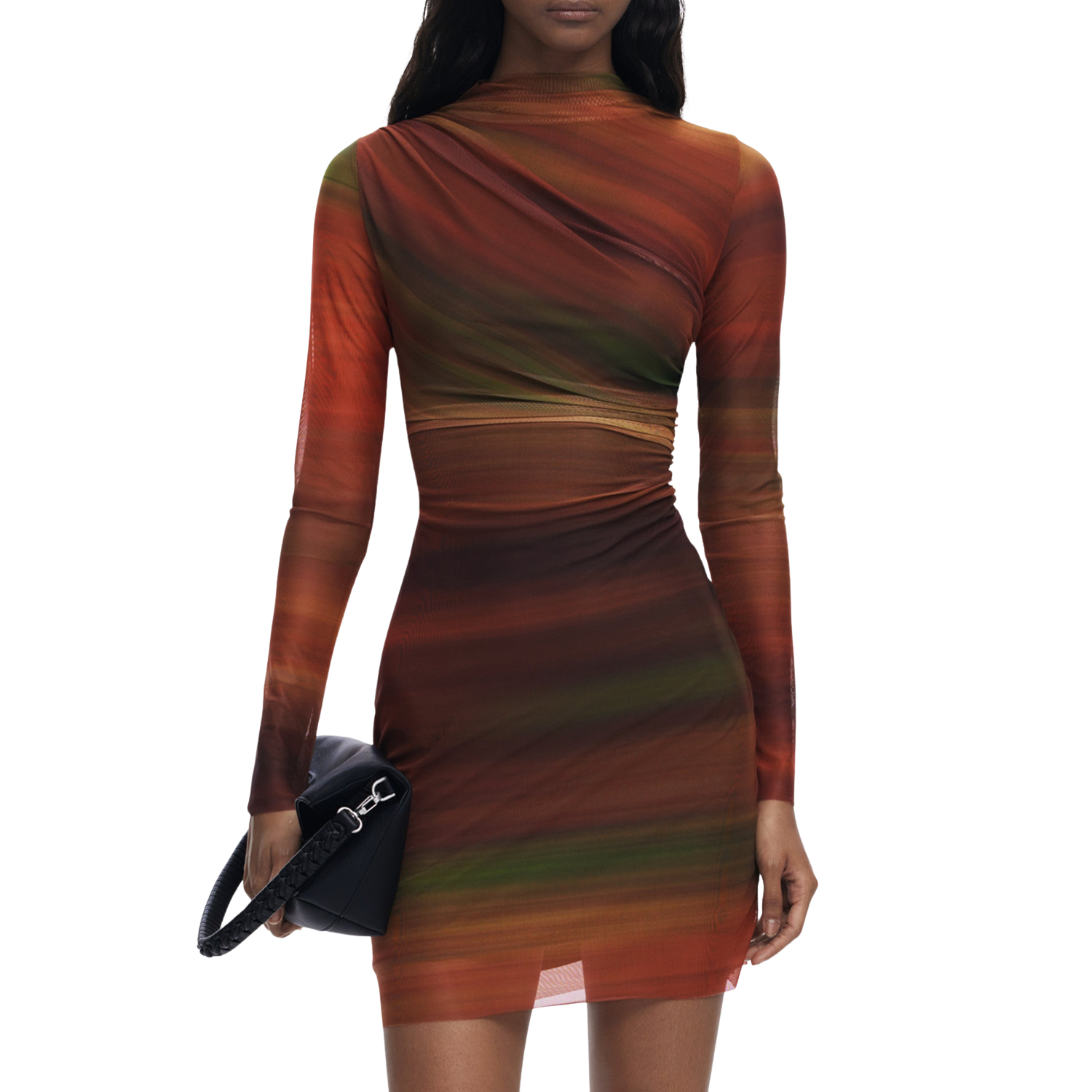 Vestido curto com mangas compridas, gola alta, pormenores em contraste e logótipo.
