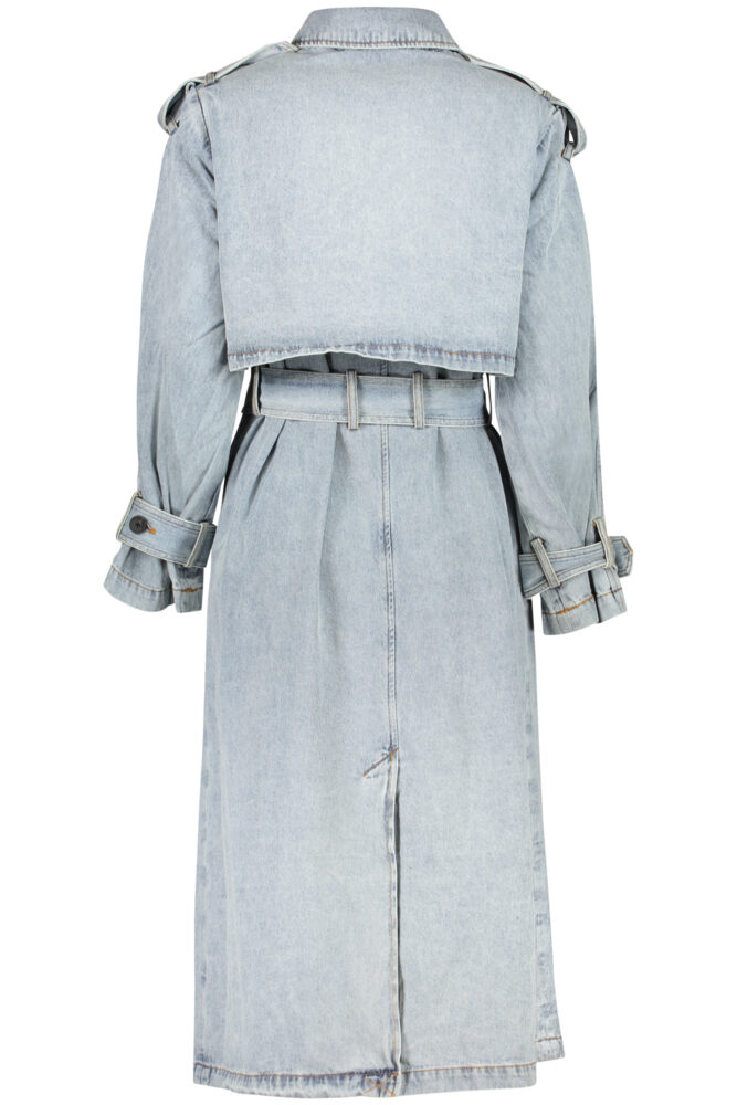 Trench coat jeans de estilo moderno e sofisticado, ideal para compor looks urbanos com um toque elegante.