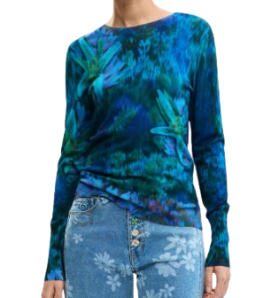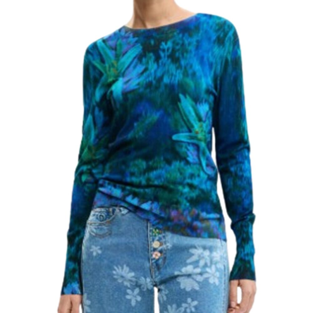 Apresenta gola redonda, estampa e logótipo discreto, conferindo um detalhe elegante ao visual.