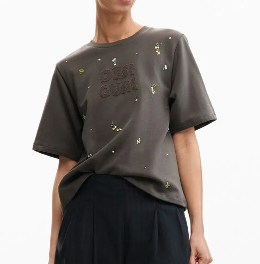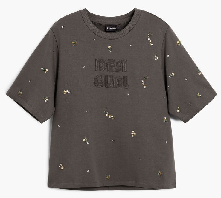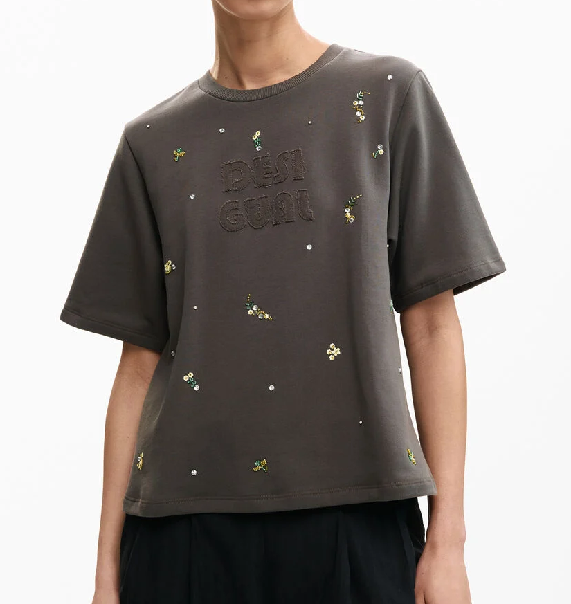 Apresenta gola redonda, aplicações de strass, bordado e logótipo, conferindo um detalhe sofisticado ao visual.