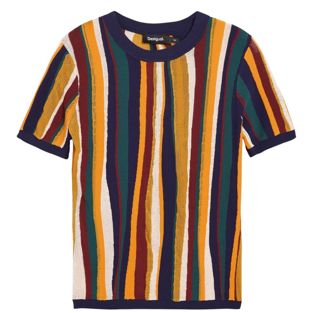 Apresenta gola redonda, padrão às riscas e logótipo, ideal para um look casual e sofisticado.