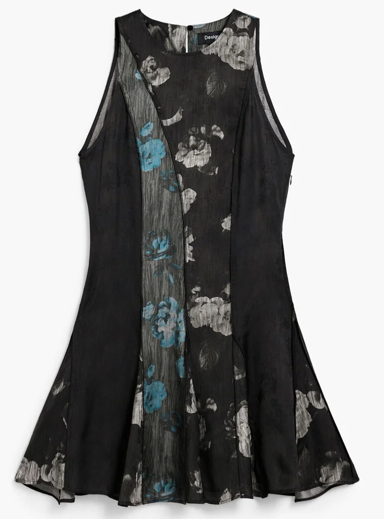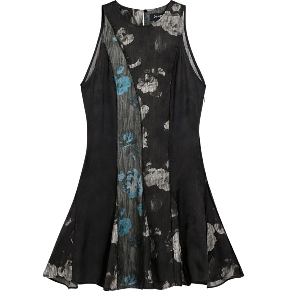 Apresenta alças largas, gola redonda, botão nas costas, zíper lateral, detalhes contrastantes e estampa com logótipo, ideal para um look casual sofisticado.