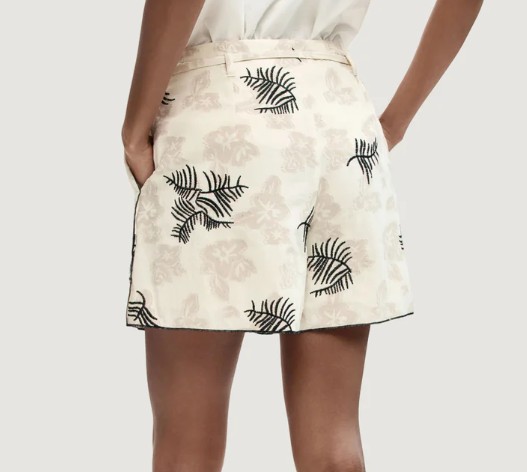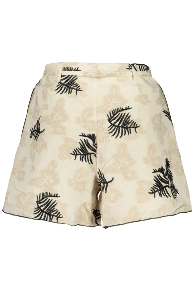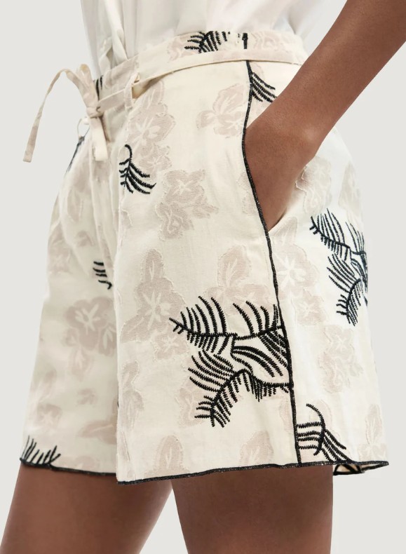 Apresenta botões e zíper, cadarço na cintura, bordado e logótipo, ideal para um look casual e leve.