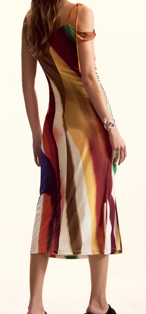 Apresenta alças finas, fenda lateral, detalhes contrastantes e logótipo, ideal para um look sofisticado e moderno.