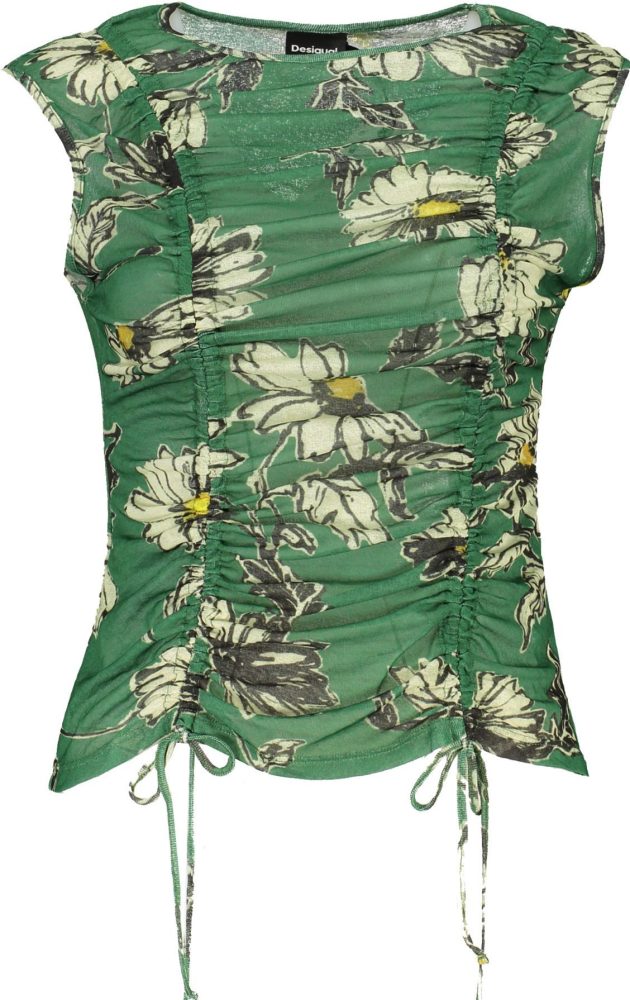 Top com ombros largos, gola redonda, detalhes contrastantes e logótipo.
