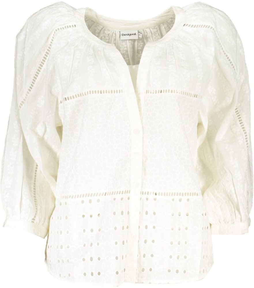 Camisa com manga comprida, decote em “v”, botões, detalhes contrastantes e logótipo.