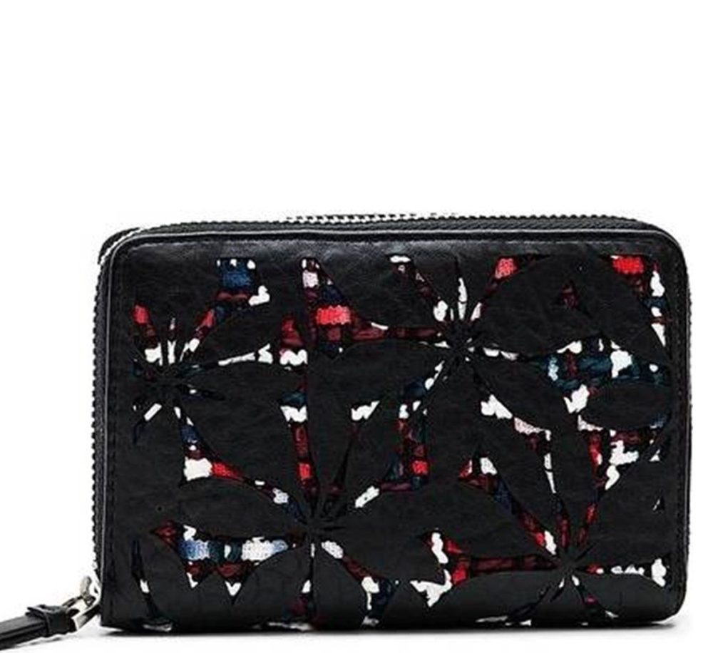 Carteira com 2 compartimentos, espaço para cartões, bolsa de moedas, detalhes de contraste, fecho zíper, logótipo.