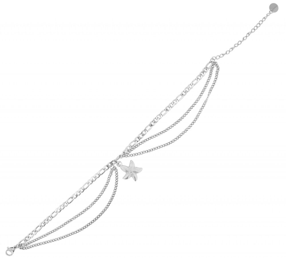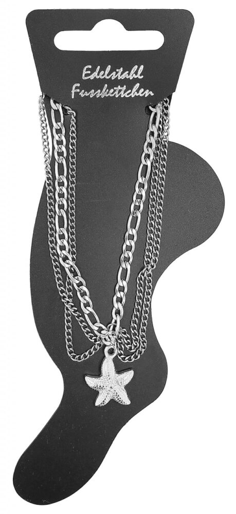 A tornozeleira marítima da marca Akzent é feita de aço inoxidável e tem três fileiras. A corrente mais grossa (4 mm) no padrão da armadura é decorada com um pequeno pingente de estrela do mar. Ele pode ser aberto e fechado com um mosquetão, que também é feito de aço inoxidável. Uma corrente de extensão de 5 cm de comprimento presa a uma extremidade da corrente permite que o comprimento seja variado em até 5 cm, para que a tornozeleira possa ser ajustada para se adaptar a qualquer tornozelo. As dimensões resultam de um comprimento de 21 cm e uma espessura de corrente de 1 mm. O pingente de estrela do mar tem 15 mm de largura, 20 mm de comprimento e uma espessura de material de 4 mm.