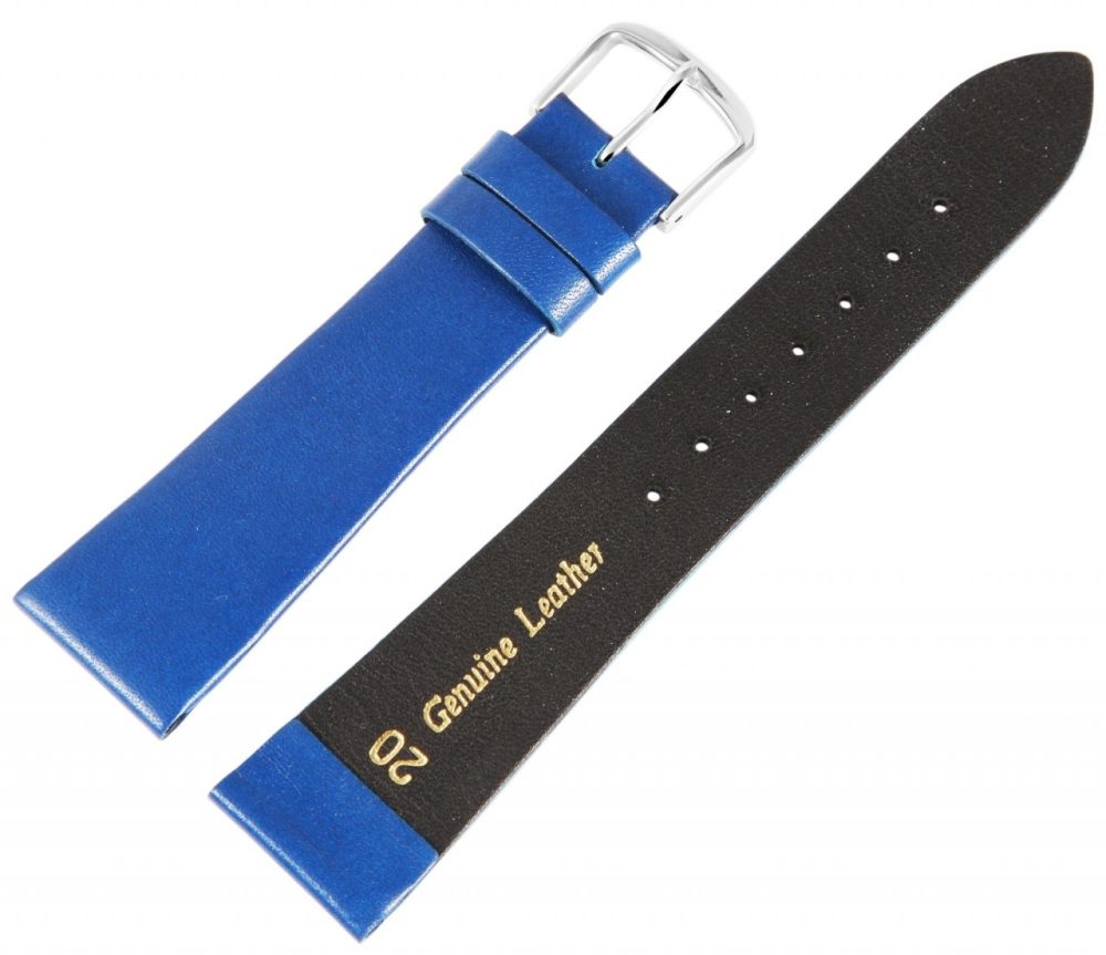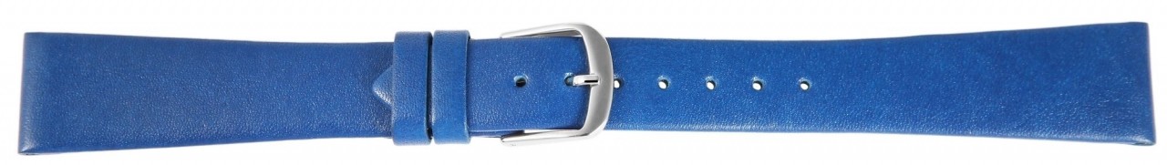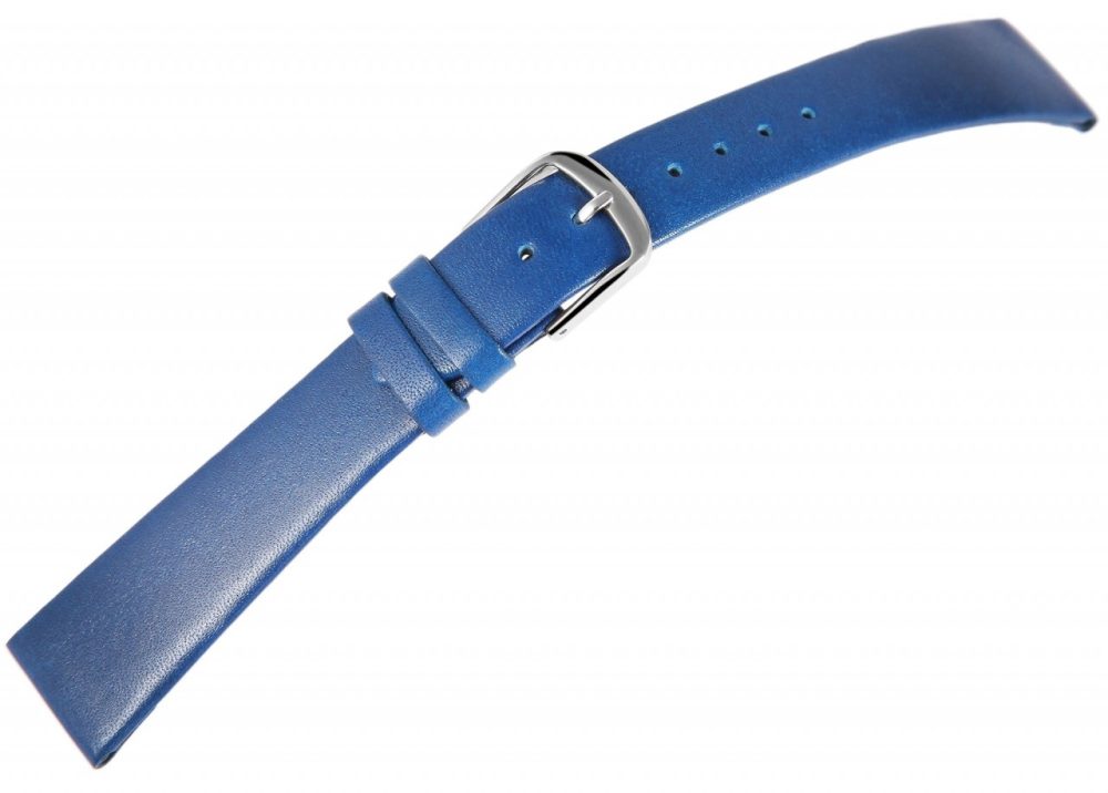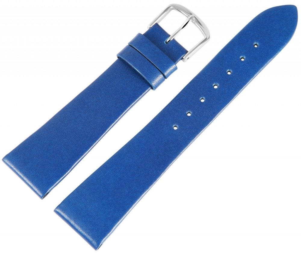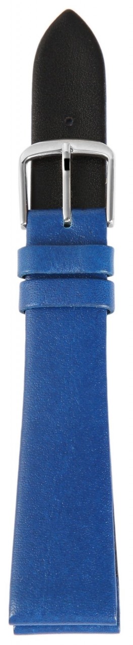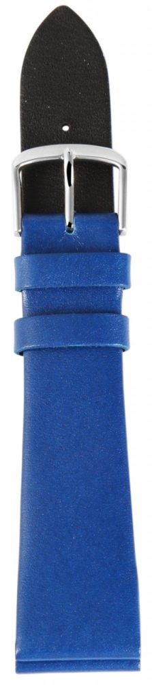 Pulseira básica de couro genuíno em azul royal. A pulseira tem uma fivela prateada e duas presilhas. A parte do furo afunila até uma ponta no final.