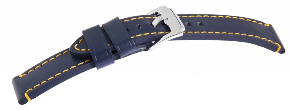 A bracelete azul escura é feita em couro genuíno e tem uma largura de 18-26 mm. O comprimento total da bracelete é de 22 cm e a espessura do material é de 4 mm. A bracelete de substituição pode ser aberta e fechada com uma fivela de pino prateada e altamente polida. A costura amarela garante uma boa durabilidade e estabilidade. O acabamento brilhante em combinação com a bracelete em pele ligeiramente lisa realça o belo design da bracelete do relógio e torna-a rápida e fácil de colocar e retirar.