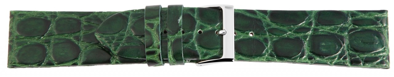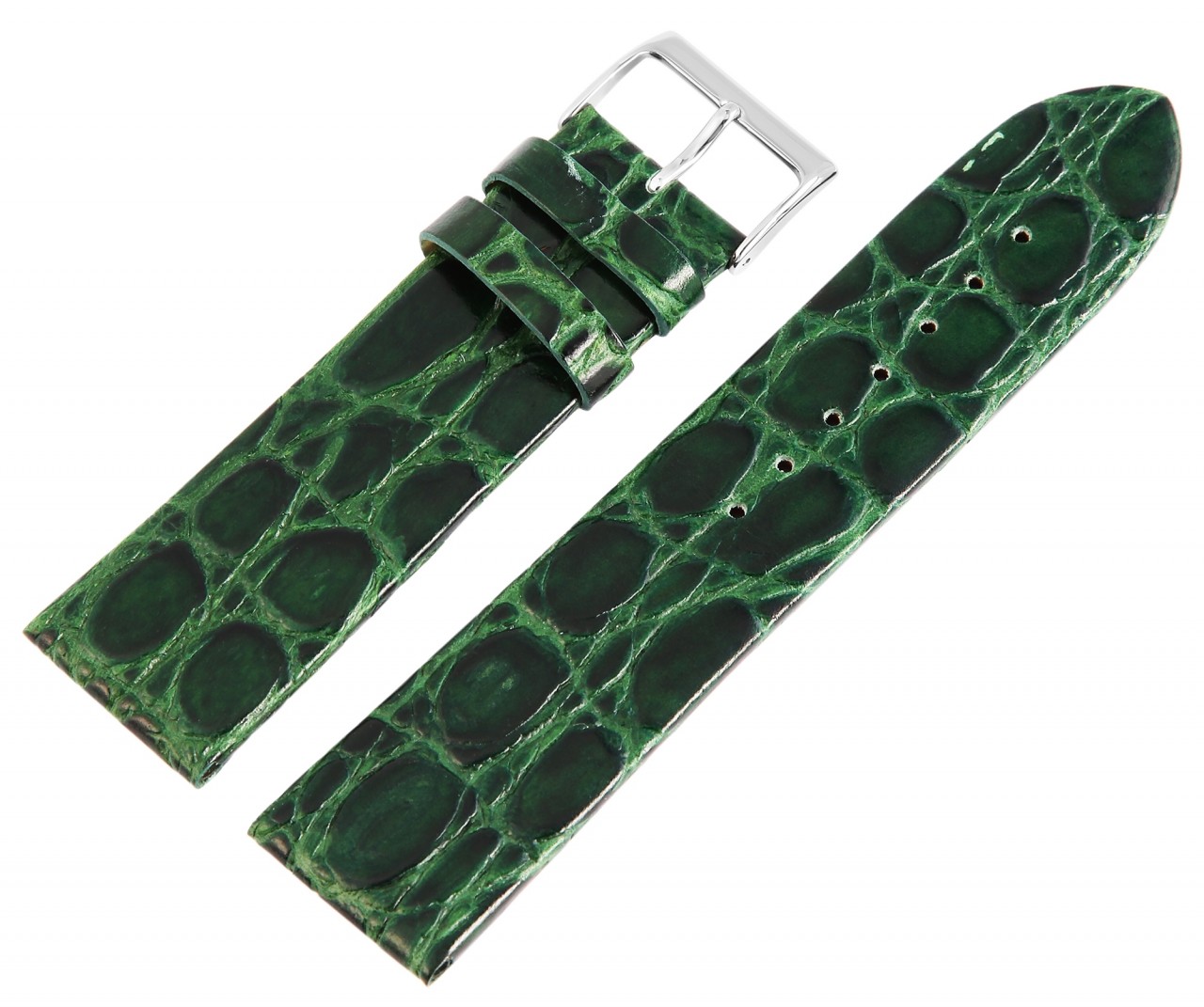 Pulseira clássica de reposição em couro genuíno na cor verde. O terminal da ponte é acolchoado em ambos os lados. É feito de couro bovino e gravado com um design de couro de crocodilo. A pulseira tem uma fivela prateada e duas presilhas. A parte do furo afunila até uma ponta no final.