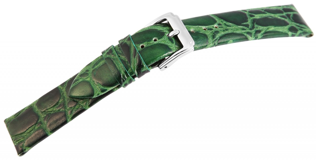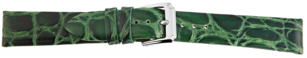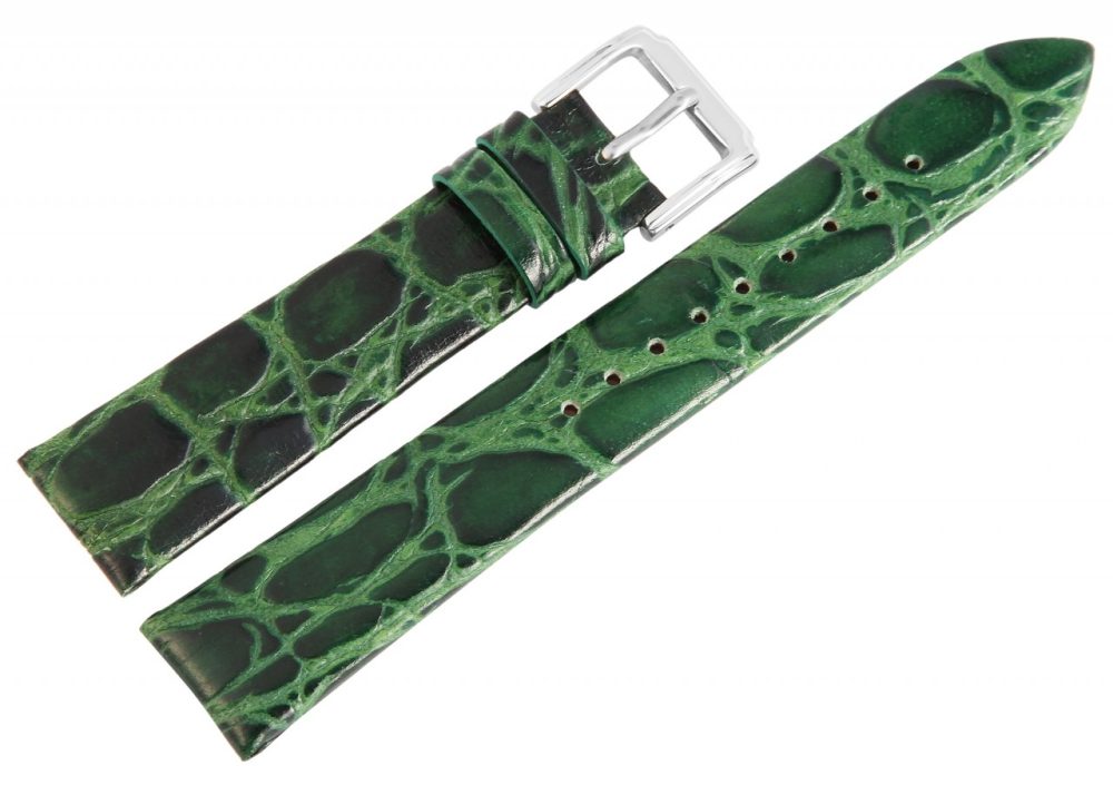 Pulseira clássica de reposição em couro genuíno na cor verde. O terminal da ponte é acolchoado em ambos os lados. É feito de couro bovino e gravado com um design de couro de crocodilo. A pulseira tem uma fivela prateada e duas presilhas. A parte do furo afunila até uma ponta no final.