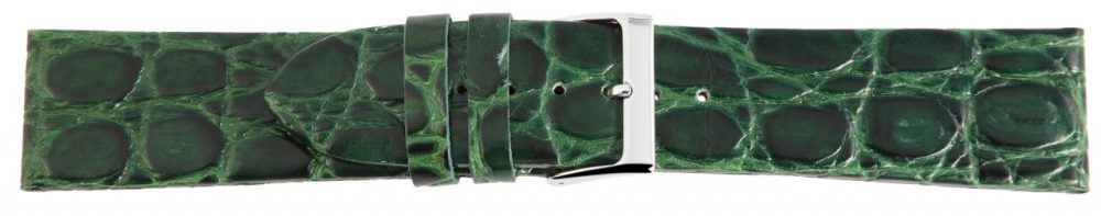 Pulseira clássica de reposição em couro genuíno na cor verde. O terminal da ponte é acolchoado em ambos os lados. É feito de couro bovino e gravado com um design de couro de crocodilo. A pulseira tem uma fivela prateada e duas presilhas. A parte do furo afunila até uma ponta no final.