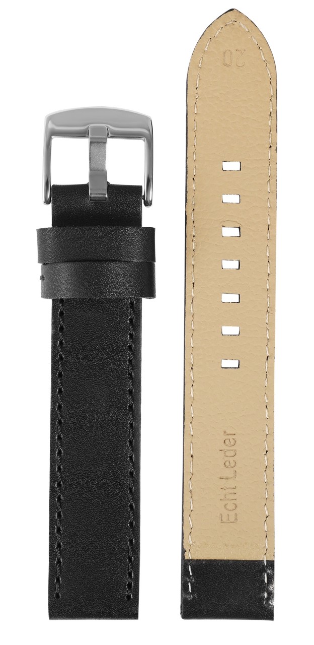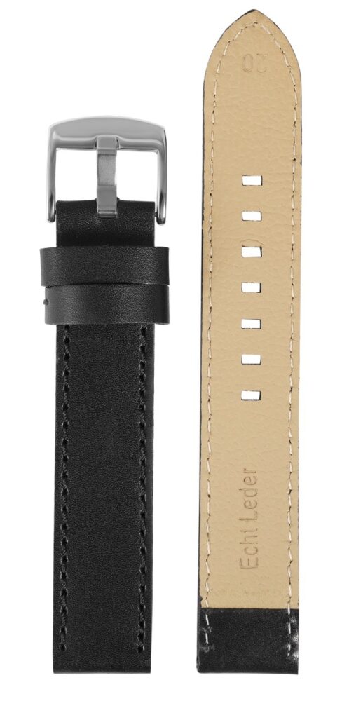 Nossa pulseira de reposição de relógio de alta qualidade é feita de couro genuíno, macio e liso em preto e é decorada com costura preta. Com uma largura de 20 mm, ele se adapta a uma variedade de modelos de relógios. O comprimento total da pulseira é de 23,5 cm, consistindo de um furo com 13 cm de comprimento e um fecho com 10,5 cm de comprimento. Com espessura de 3,5 mm, oferece o equilíbrio perfeito entre robustez e conforto. A fivela prateada e as duas presilhas da pulseira, uma das quais costurada, proporcionam suporte e segurança adicionais. A parte do furo afunila em uma ponta e dá ao design um acabamento elegante. O couro macio e liso garante um ajuste confortável e prova ser durável e funcional. Esta pulseira confere a qualquer relógio um visual clássico e elegante e é a escolha ideal para o dia a dia.