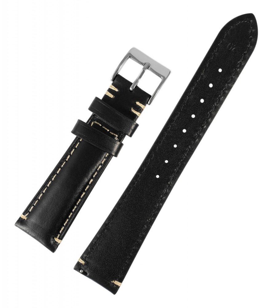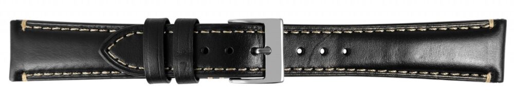 Aus Echtleder erhalten Sie dieses schwarze Uhrenarmband in unserem Großhandel in Anstoßbreiten 18 mm, 20 mm und 22 mm . Die glatte Oberfläche, die teilweise Polsterung und die Naht machen dieses Uhrenarmband zu einem echten Allrounder. Die Anstoßbreite und der Schließenanstoß haben unterschiedliche Maße, da das Uhrenarmband sich zur Schließe hin verjüngt. Die Materialstärke beträgt im gepolsterten Bereich 5 mm. Das Uhrenarmband lässt sich mit einer silberfarbenen Dornschließe aus Edelstahl öffnen und schließen und es hat zwei Armbandschlaufen.