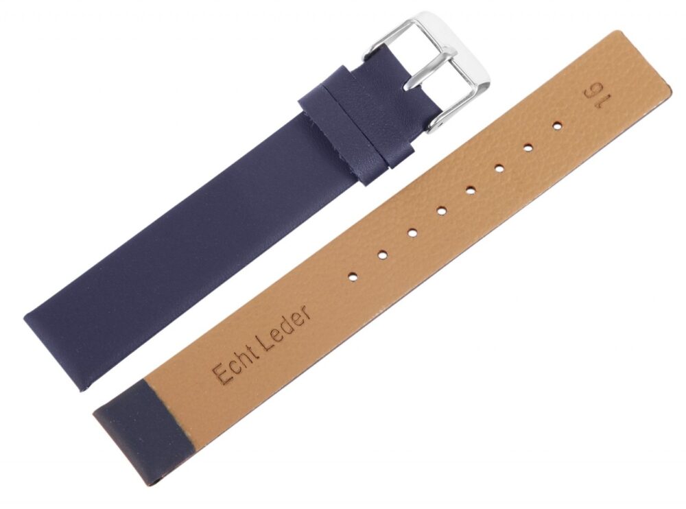 A bracelete azul escura é fabricada em pele genuína. O comprimento total da bracelete situa-se entre 20,5 cm e 22 cm e a espessura do material é de 2 mm. O comprimento depende da largura da argola. A bracelete de substituição pode ser aberta e fechada com uma fivela de pino prateada e altamente polida. O acabamento brilhante em combinação com a bracelete em pele ligeiramente mate realça o belo design da bracelete do relógio e torna-a rápida e fácil de pôr e tirar.