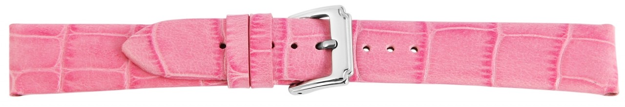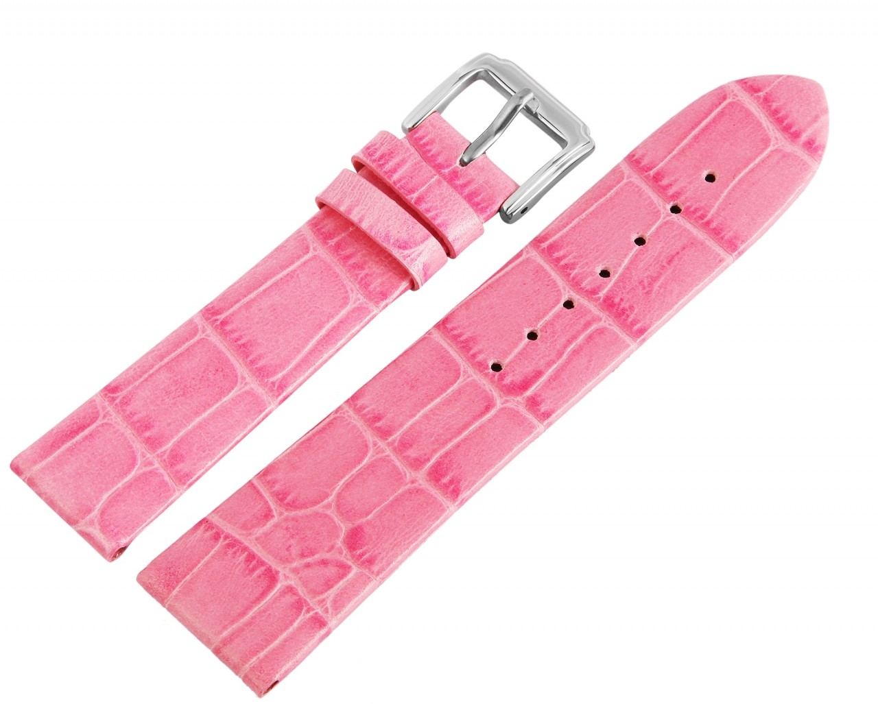 Pulseira clássica de reposição em couro genuíno na cor rosa. É feito do melhor couro bovino e gravado com um design de couro de crocodilo. A pulseira tem uma fivela prateada e duas presilhas. A parte do furo afunila até uma ponta no final.