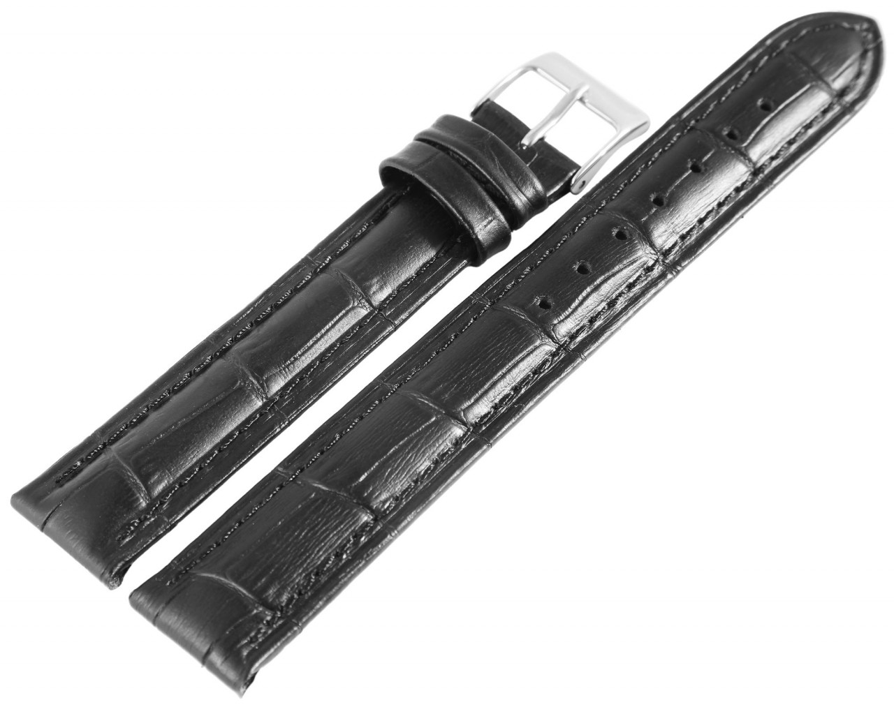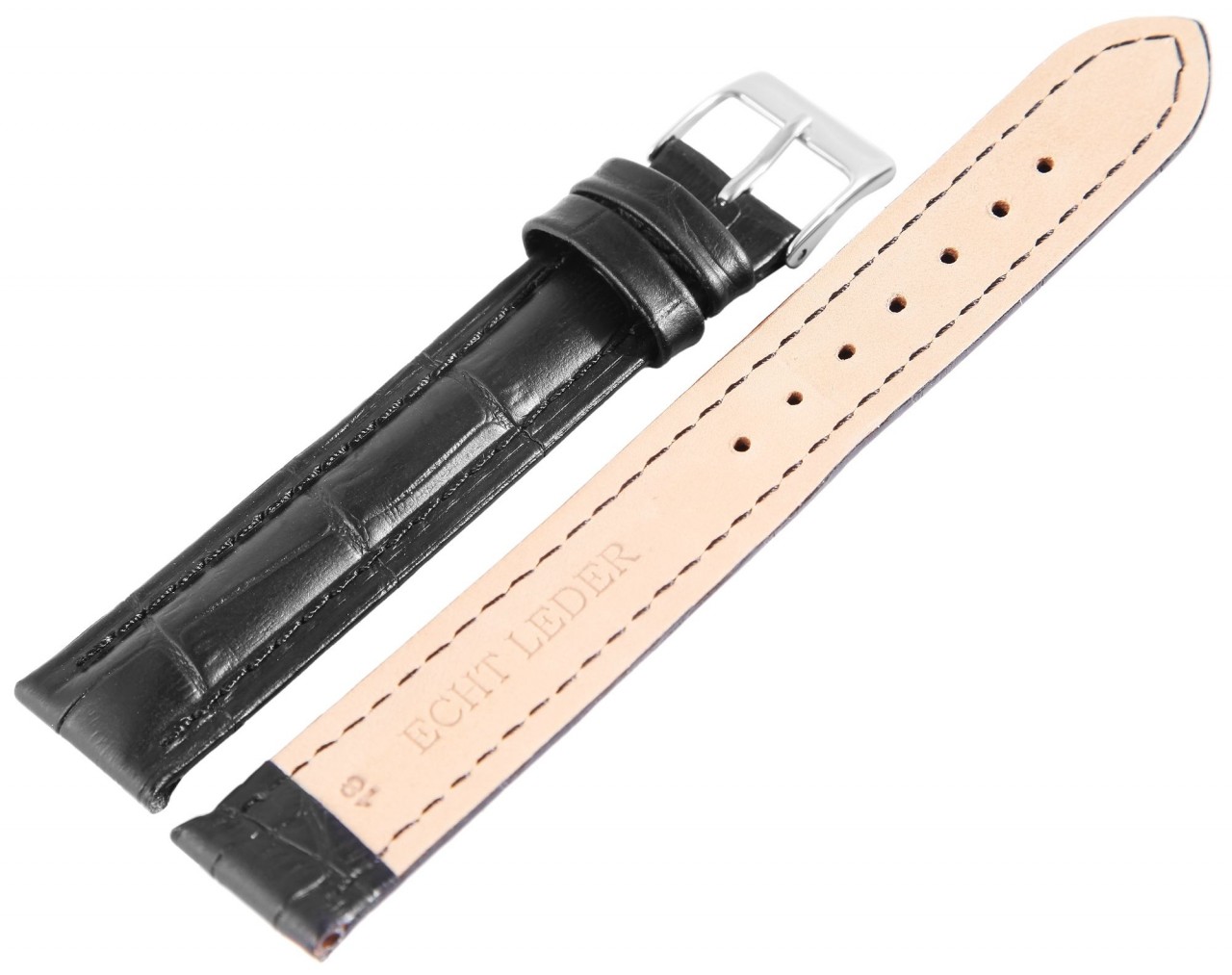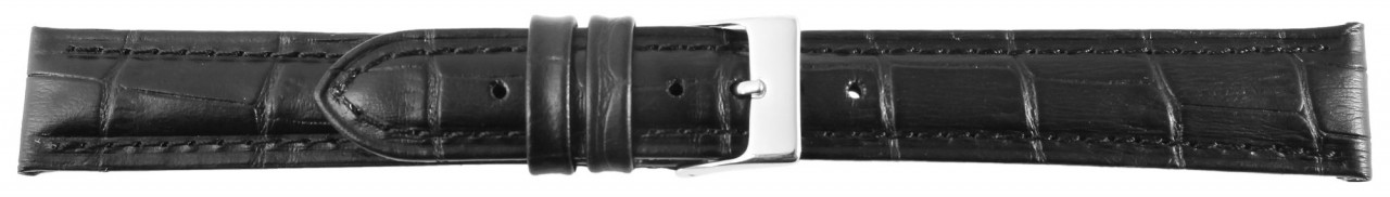 Bracelete de substituição clássica em pele genuína na cor preta. As costuras exteriores são da mesma cor preta. É fabricada com a melhor pele de vaca e apresenta um desenho em pele de crocodilo. A bracelete tem uma fivela com pino prateado e duas presilhas. A secção do orifício afunila para um ponto na extremidade.