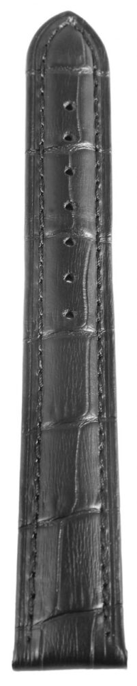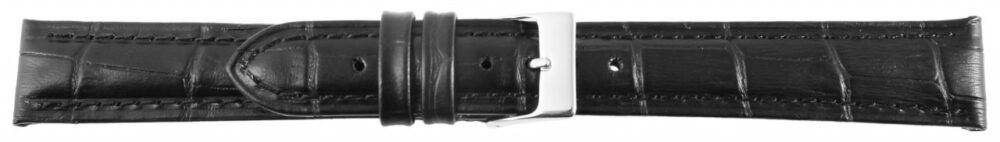 Bracelete de substituição clássica em pele genuína na cor preta. As costuras exteriores são da mesma cor preta. É fabricada com a melhor pele de vaca e apresenta um desenho em pele de crocodilo. A bracelete tem uma fivela com pino prateado e duas presilhas. A secção do orifício afunila para um ponto na extremidade.