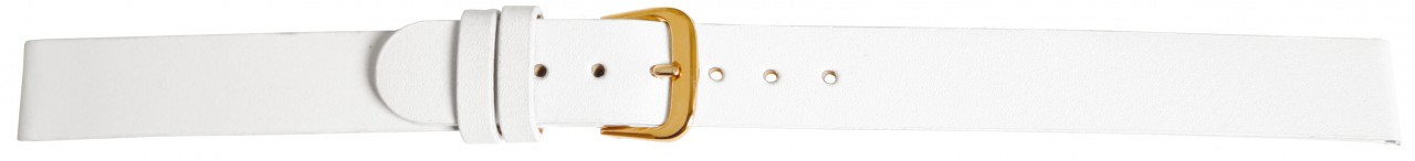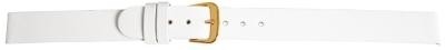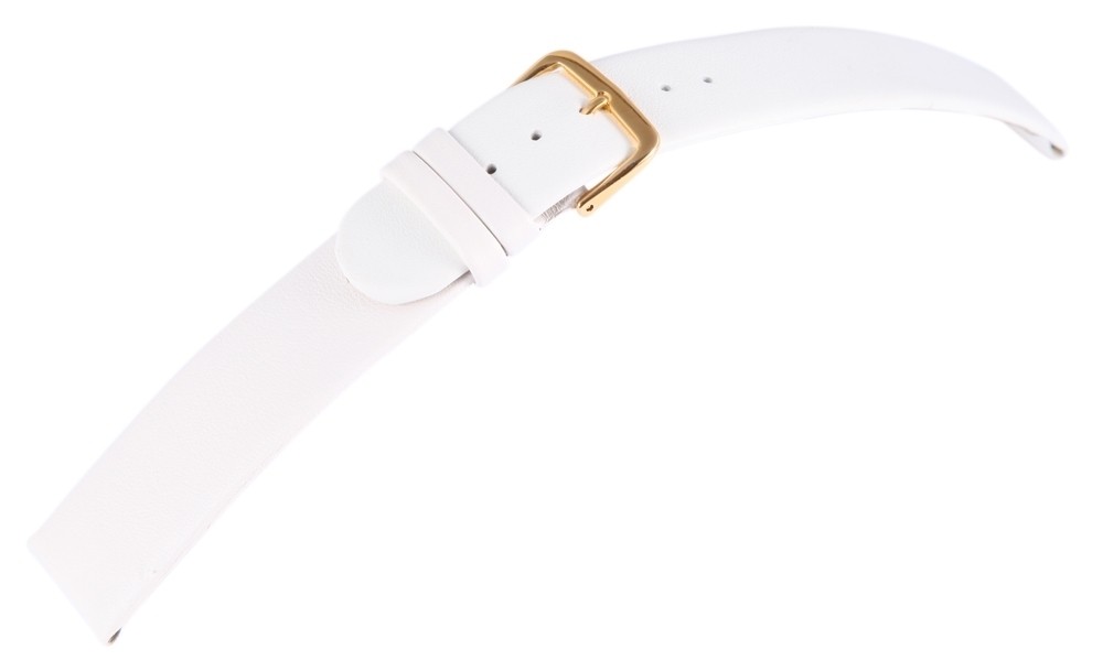 Pulseira de reposição clássica em couro genuíno na cor branca. Foi feito de couro de bezerro. A pulseira tem uma fivela de alfinete e duas presilhas. A parte do furo afunila no final. As pulseiras são entregues em display. O display está equipado com 3 pulseiras de reposição com fecho dourado e 9 pulseiras de reposição com fecho prateado.