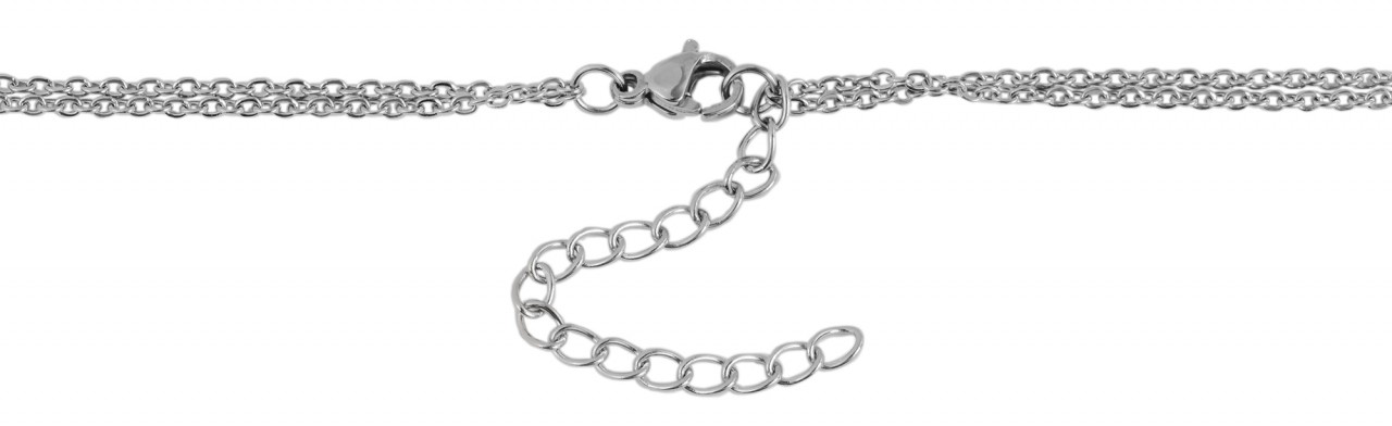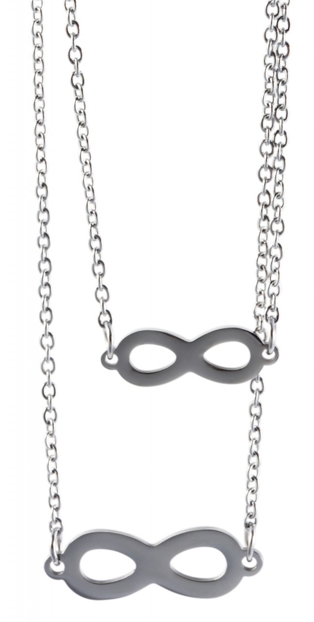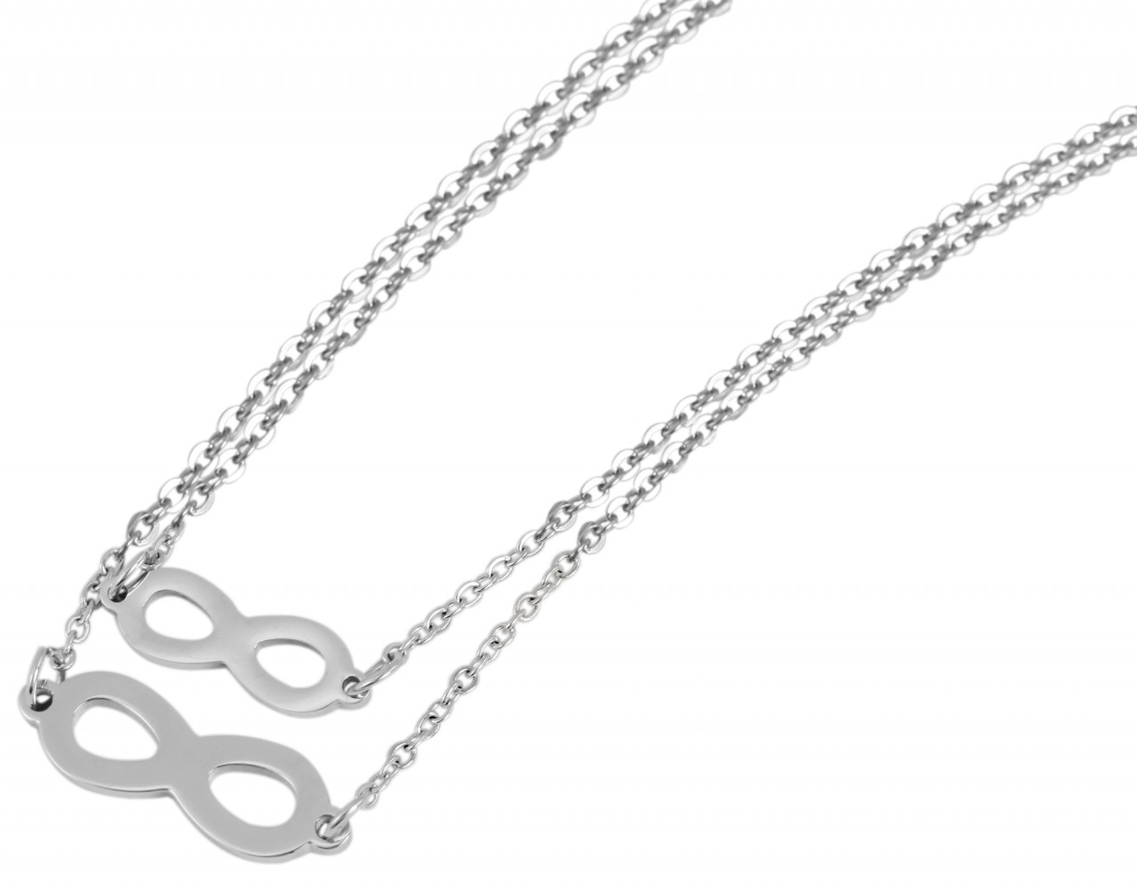 O conjunto de joias da marca Praktik é feito de aço inoxidável e é composto por brincos e uma corrente. A corrente de âncora de duas carreiras tem 43 cm de comprimento, 1 mm de largura e 1 mm de espessura. A primeira fileira de correntes é decorada com um pequeno pingente no símbolo do infinito. Tem 6 mm de comprimento, 18 mm de largura e 1,5 mm de espessura. A segunda linha com um pingente maior e do mesmo formato. Tem comprimento de 7 mm, largura de 22 mm e espessura de 1,5 mm. Ambos os pingentes são prateados e altamente polidos. A corrente pode ser aberta e fechada com um mosquetão resistente de aço…