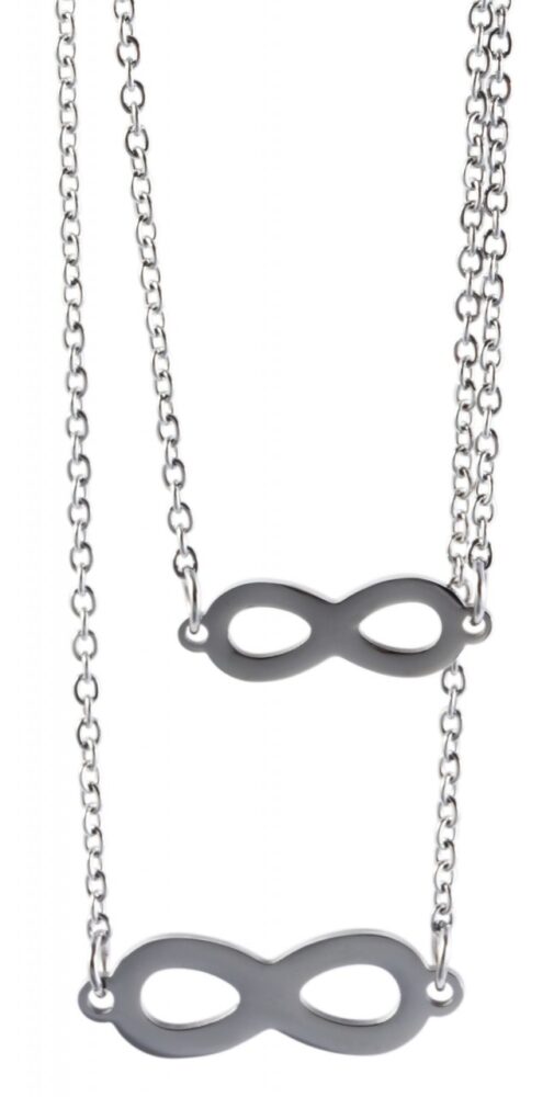 O conjunto de joias da marca Praktik é feito de aço inoxidável e é composto por brincos e uma corrente. A corrente de âncora de duas carreiras tem 43 cm de comprimento, 1 mm de largura e 1 mm de espessura. A primeira fileira de correntes é decorada com um pequeno pingente no símbolo do infinito. Tem 6 mm de comprimento, 18 mm de largura e 1,5 mm de espessura. A segunda linha com um pingente maior e do mesmo formato. Tem comprimento de 7 mm, largura de 22 mm e espessura de 1,5 mm. Ambos os pingentes são prateados e altamente polidos. A corrente pode ser aberta e fechada com um mosquetão resistente de aço inoxidável. Os brincos correspondentes têm comprimento de 13,5 mm, largura de 5,5 mm e espessura de 1 mm. As porcas de conforto, fornecidas com uma placa de silicone, fornecem suporte adicional para os brincos.