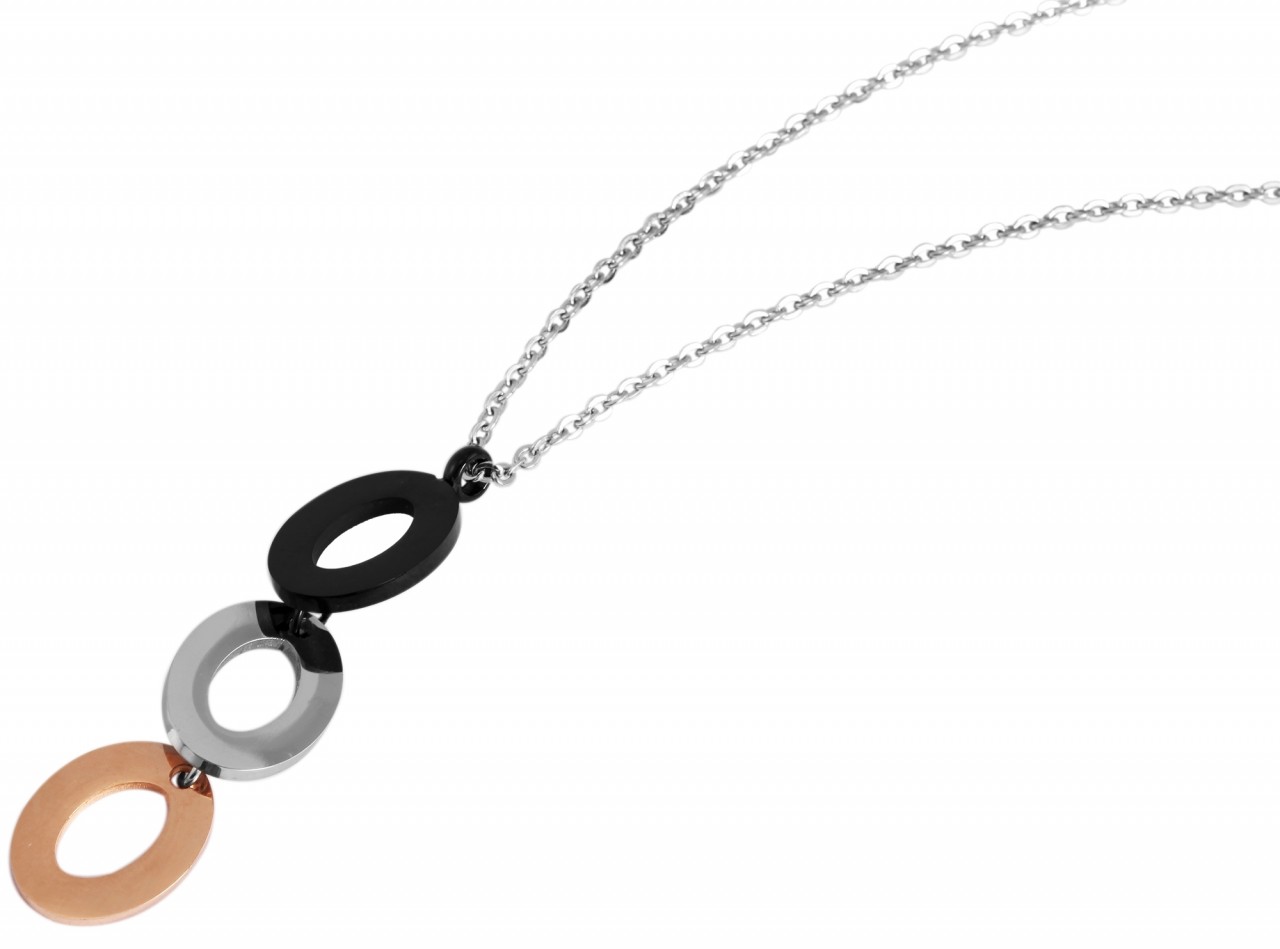 O conjunto de jóias Akzent é feito de aço inoxidável e é composto por brincos e uma corrente. A corrente de âncora tem 43 cm de comprimento, 1 mm de largura e 1 mm de espessura. Uma corrente de extensão de 5 cm está também ligada à extremidade da corrente, permitindo-lhe variar o comprimento até 5 cm e adaptá-la a qualquer roupa. A corrente pode ser aberta e fechada com um mosquetão robusto em aço inoxidável. O pendente da corrente de âncora é composto por três elementos de aço inoxidável de forma oval e empilhados nas cores dourado, prateado e ouro rosa. Estes são altamente polidos e abrem-se no centro. O pendente mede 4,5 cm de comprimento, 11 mm de largura e 1,5 mm de espessura. Os brincos a condizer na cor prata, também muito polidos e abertos no centro, têm 12 mm de comprimento, 10 mm de largura e 1,5 mm de espessura.