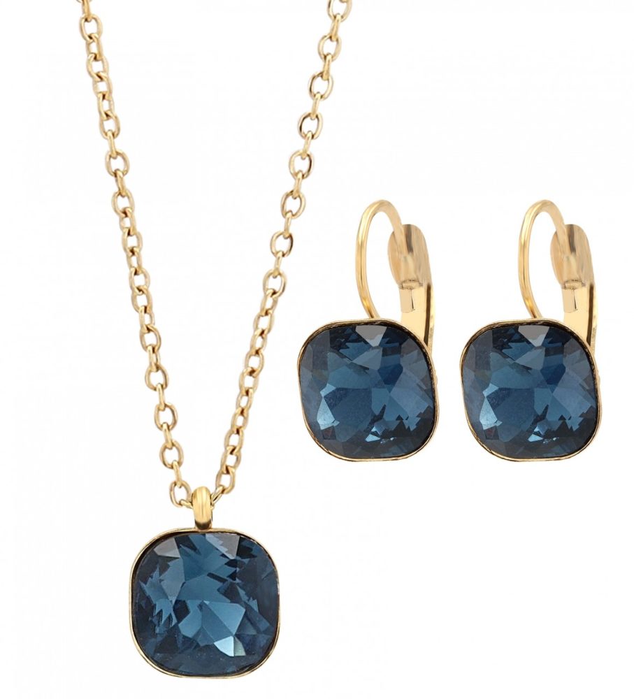 Este moderno conjunto de joias é feito em aço inoxidável dourado de alta qualidade e pedras azuis. Composto por uma corrente de 45 cm de comprimento com pingente e brincos combinando.