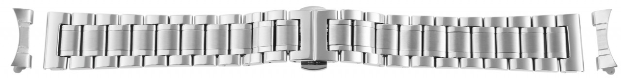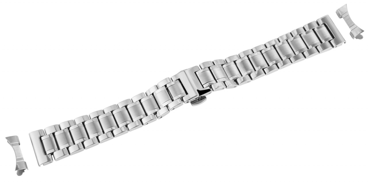 A bracelete do relógio prateada é feita de aço inoxidável e pode ser aberta e fechada usando um fecho dobrável tipo borboleta em aço inoxidável prateado. A bracelete de substituição é composta por vários elementos que podem ser removidos com pouco esforço. Isto significa que a bracelete pode ser ajustada individualmente a cada pulso. O comprimento total da bracelete de elos é de 17,5 cm. Está disponível em larguras de terminais de 18 mm, 20 mm, 22 mm e 24 mm. O pontapé inicial é substituível. É possível usar uma alça semicircular que se adapta perfeitamente à caixa, ou você pode usar uma alça reta que confere ao relógio um visual especial. Cada elemento individual consiste em cinco peças individuais, que fazem com que a bracelete de aço inoxidável pareça cinco fileiras quando montada. Com exceção da linha do meio, que é fosca, a bracelete de aço inoxidável é totalmente polida.