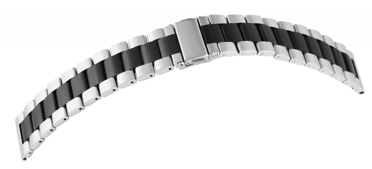 A bracelete de substituição do relógio preta e prateada é feita de aço inoxidável e pode ser aberta e fechada usando um fecho dobrável de aço inoxidável prateado. A bracelete de substituição é composta por vários elementos que podem ser removidos com pouco esforço. Isto significa que a bracelete pode ser ajustada individualmente a cada pulso. Cada elemento consiste em três partes. As duas externas são prateadas e a peça do meio é preta. O comprimento total da banda é de 17,5 cm. A bracelete de aço inoxidável está disponível em larguras de 18 mm, 20 mm, 22 mm e 24 mm. A alça é reta e, portanto, compatível com todos os relógios. Toda a superfície da pulseira é mate. Este tipo de tratamento de superfície faz com que a pulseira do relógio pareça simples, mas também elegante e, portanto, adapta-se perfeitamente a qualquer relógio.