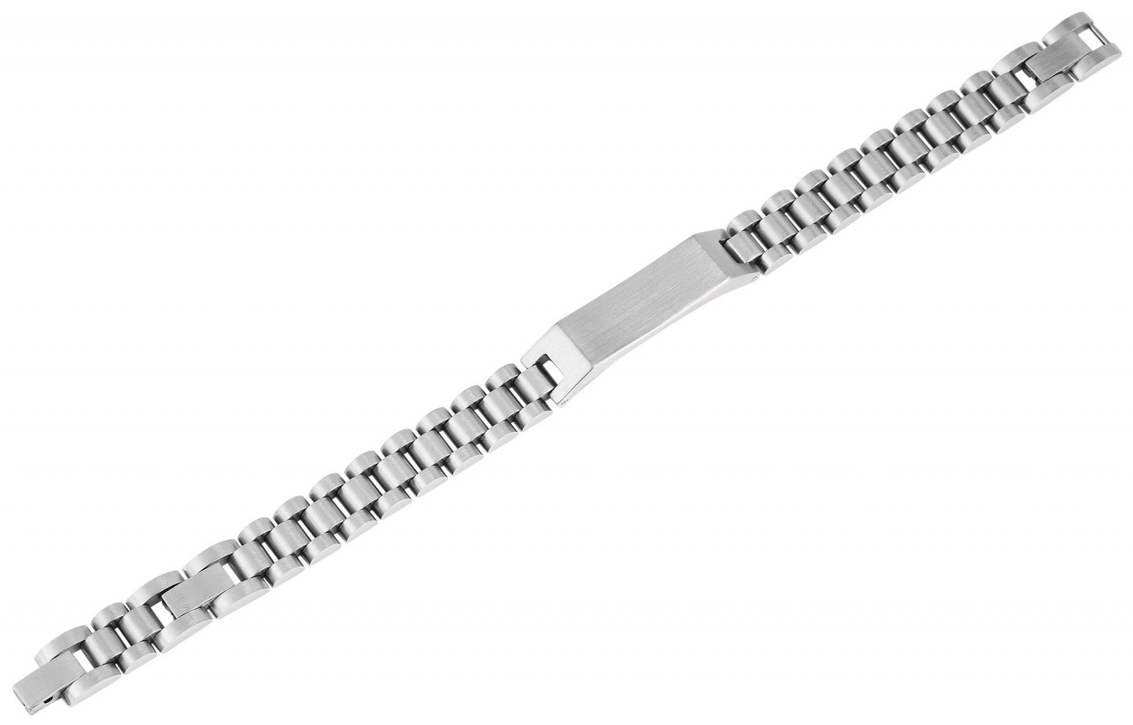 - A pulseira é feita de aço inoxidável e possui uma placa de identificação de 41 mm de comprimento.