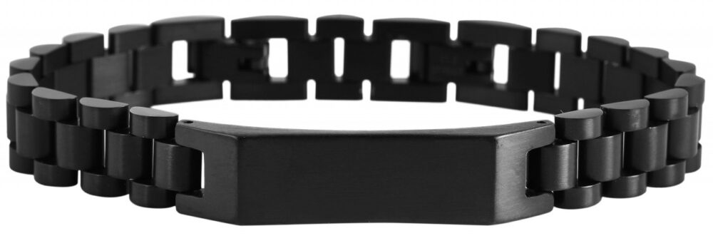 A pulseira é feita de aço inoxidável e possui uma placa para personalização de 41 mm de comprimento. Tem 11 mm de largura e oferece espaço suficiente para diversas gravações. As dimensões da pulseira de joias são comprimento total de 19 cm, largura de 1 cm e espessura do material de 0,5 cm. A pulseira simples pode ser aberta e fechada com um fecho de gancho de aço inoxidável e uma extensão de 1,5 cm permite que ela seja ajustada para caber em qualquer pulso.