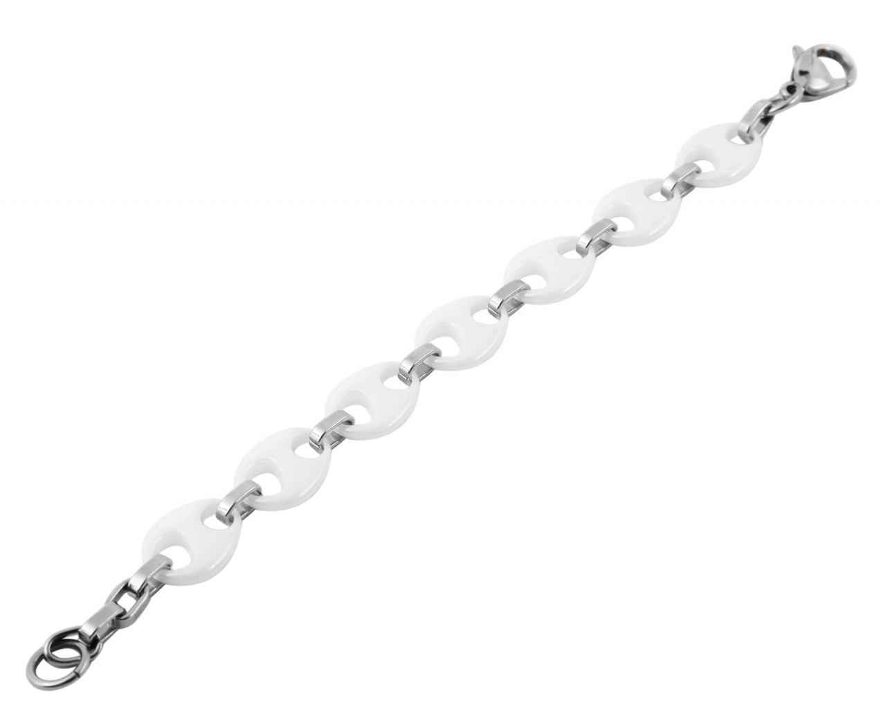 A pulseira de joias da marca Akzent é feita de aço inoxidável e cerâmica. Os elementos individuais de cerâmica branca formam o centro da pulseira e proporcionam um visual elegante. A qualidade do aço inoxidável é brilhante. No geral, a pulseira tem 21 cm de comprimento e 1,3 cm de largura. A altura dos elementos é de 0,4 cm. A pulseira pode ser fechada de forma rápida e fácil com o fecho lagosta.