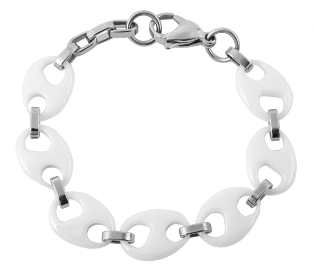 A pulseira de joias da marca Akzent é feita de aço inoxidável e cerâmica. Os elementos individuais de cerâmica branca formam o centro da pulseira e proporcionam um visual elegante. A qualidade do aço inoxidável é brilhante. No geral, a pulseira tem 21 cm de comprimento e 1,3 cm de largura. A altura dos elementos é de 0,4 cm. A pulseira pode ser fechada de forma rápida e fácil com o fecho lagosta.