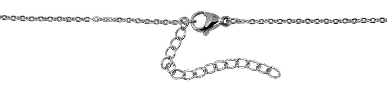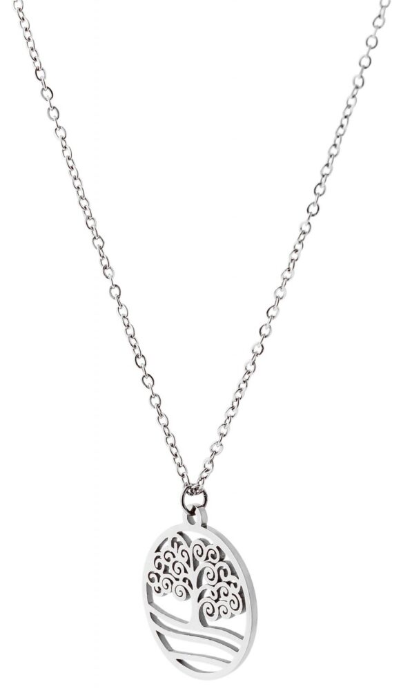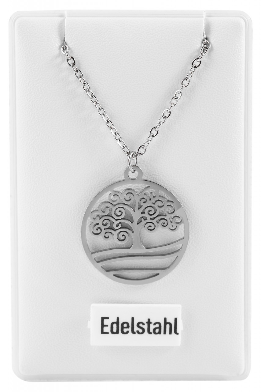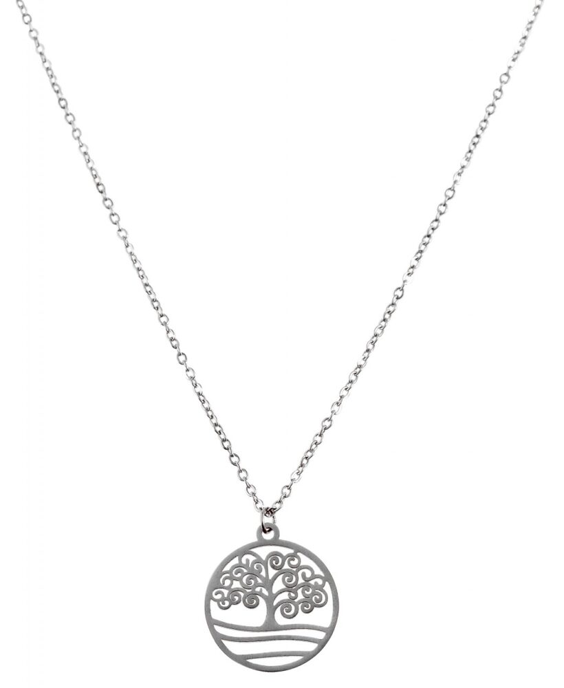 A corrente de aço inoxidável da marca Praktik é uma corrente feminina feita em padrão de âncora e presa com um fecho lagosta de aço inoxidável na parte de trás do pescoço. O tamanho do colar tem 43 cm de comprimento e pode ser ampliado individualmente em 5 cm para se adaptar a qualquer look. A corrente tem 1 mm de largura e 1 mm de espessura. Preso à corrente está um pingente redondo em forma de árvore da vida, que tem 20 mm de diâmetro e 1,5 mm de espessura.