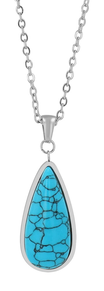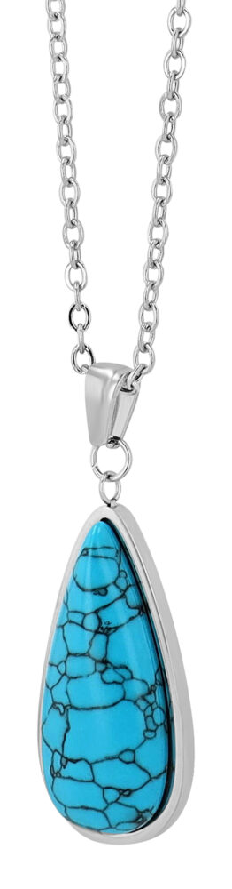 - O que mais chama a atenção é o bonito pingente em forma de gota com um brilhante enfeite turquesa que pende da corrente. Este pingente não é apenas adornado com uma pedra preciosa, mas também impressiona pelas suas dimensões generosas de 32 x 15 x 6 mm, que lhe conferem uma presença impressionante.