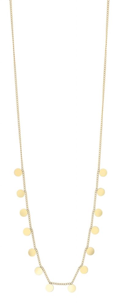 Colar em aço inoxidável dourado com pingentes. Dimensões: 40 + 5 cm.