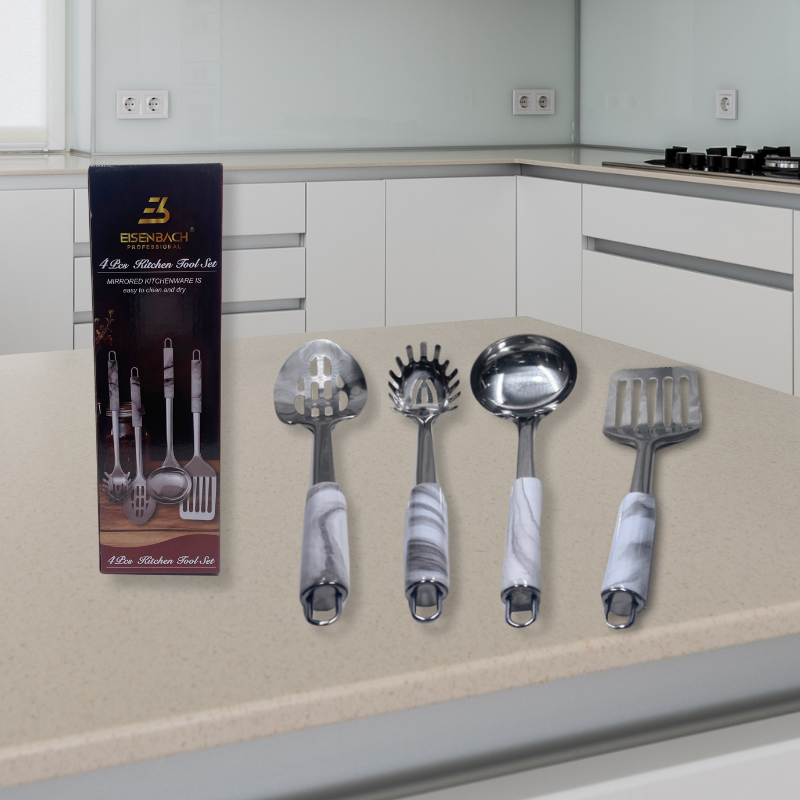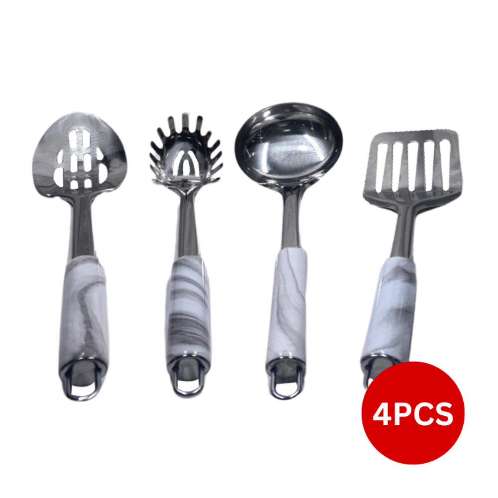 O Conjunto de Utensílios de Cozinha de 4 Peças em Aço Inoxidável – Mármore combina elegância e praticidade com a sua construção em aço inoxidável de alta qualidade e um design elegante com cabo em mármore. Cada utensílio possui arestas lisas e polidas que são suaves para os utensílios de cozinha, evitando riscos e assegurando a compatibilidade com superfícies antiaderentes. O acabamento polido espelhado não só melhora a estética, como também evita a aderência de manchas e partículas de alimentos, tornando a limpeza rápida e sem complicações.