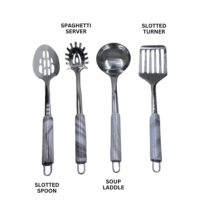 - Conjunto versátil de 4 peças – Inclui Slotted Turner, Soup Ladle, Spaghetti Server e Slotted Spoon para lidar com uma variedade de tarefas de cozinhar e servir.O conjunto fornece ferramentas essenciais para uma ampla gama de necessidades de cozinha, como virar panquecas, servir sopas, escorrer massas e mexer molhos, garantindo versatilidade para a culinária diária.