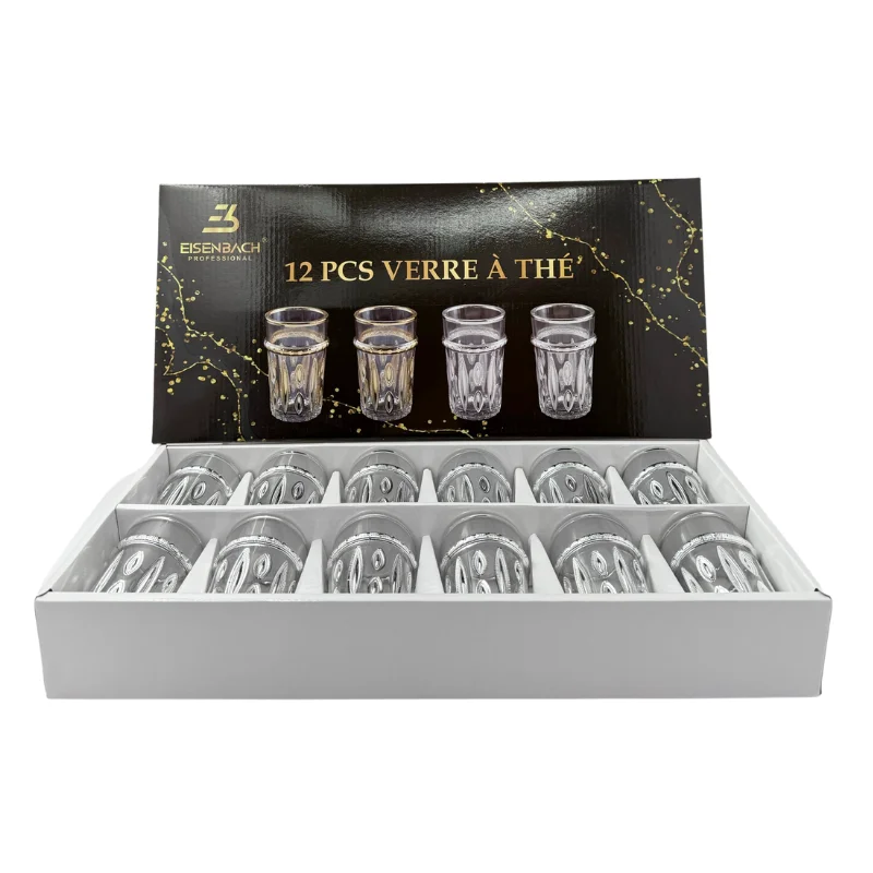 O Eisenbach EB-GLS12S 12-Piece Tea Glass Set traz elegância e sofisticação a qualquer ocasião para servir chá. Concebida para 12 pessoas, esta requintada coleção apresenta vidro transparente de alta qualidade com um requintado toque prateado, realçando a estética da sua mesa. Quer sirva o clássico chá turco ou as suas infusões de ervas favoritas, estes copos criam uma atmosfera luxuosa, tornando-os perfeitos tanto para o uso quotidiano como para reuniões especiais.