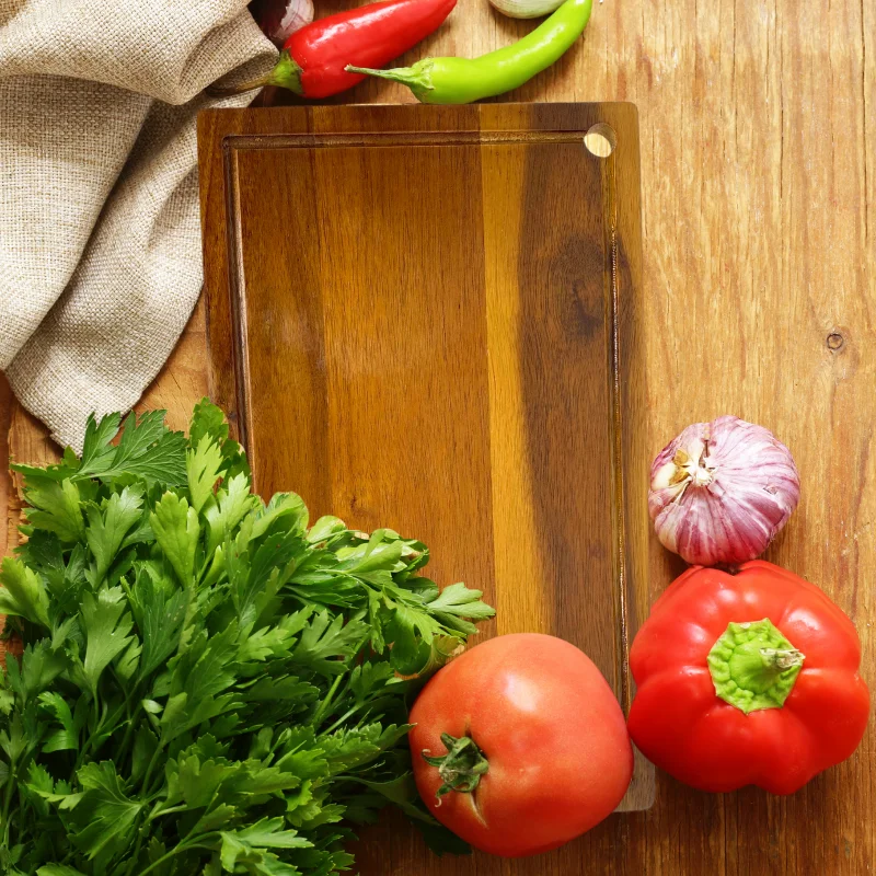 - Design com ranhura para suco – A ranhura integrada corre ao longo das bordas da tábua para coletar sucos de carne, frutas ou vegetais, evitando derramamentos e mantendo suas bancadas limpas e sem bagunça.