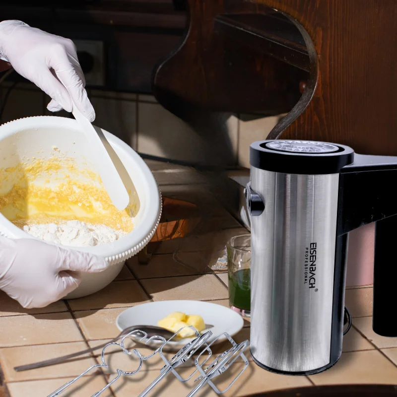 - Utensílio de cozinha versátil – O Eisenbach JE-904E é mais do que apenas um mixer; é um companheiro de cozinha versátil capaz de lidar com várias tarefas de cozimento e panificação. Quer você esteja amassando massa para pão, batendo suspiros fofos ou misturando massa para bolos, este mixer de mão atende a diversas necessidades culinárias, tornando-o uma ferramenta essencial para padeiros iniciantes e experientes.